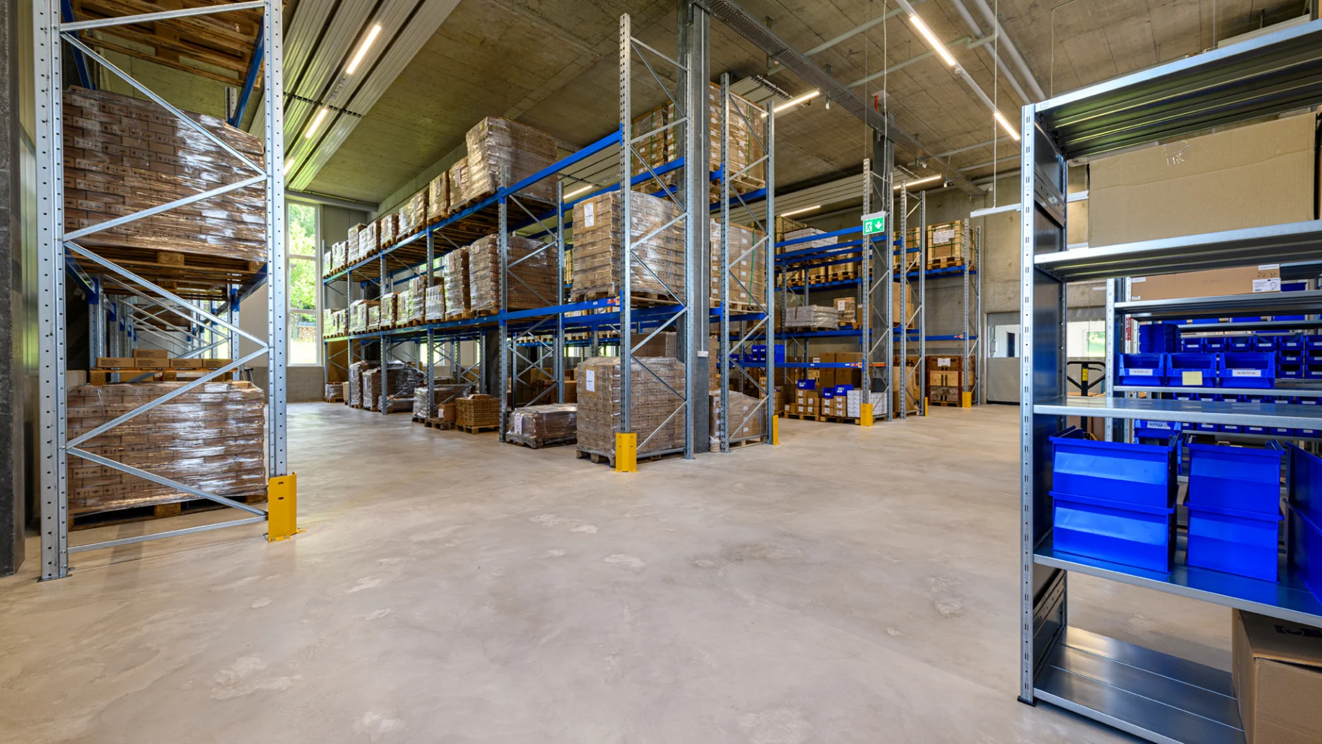 Nach über 50 Jahren am Standort Au konnte Ende 2021 das neue Domizil in Oberbüren, Kanton St. Gallen, bezogen werden. Das ökologisch vorbildliche Gebäude mit eigener Photovoltaik- und Erdsondenanlage bietet mit 570 m² Lager- und Logistikfläche ausreichend Platz für eine zuverlässige Belieferung des Schweizer Marktes mit Standardartikeln. Zwei Drittel der Lagerfläche sind für Paletten vorgesehen, der Rest ist mit Regalen für offene Ware ausgestattet. Service, Packstation und Versand befinden sich auf derselben Ebene. Im grosszügigen Schulungs- und Ausstellungsraum können individuelle Trainings für bis zu 20 Personen durchgeführt werden.