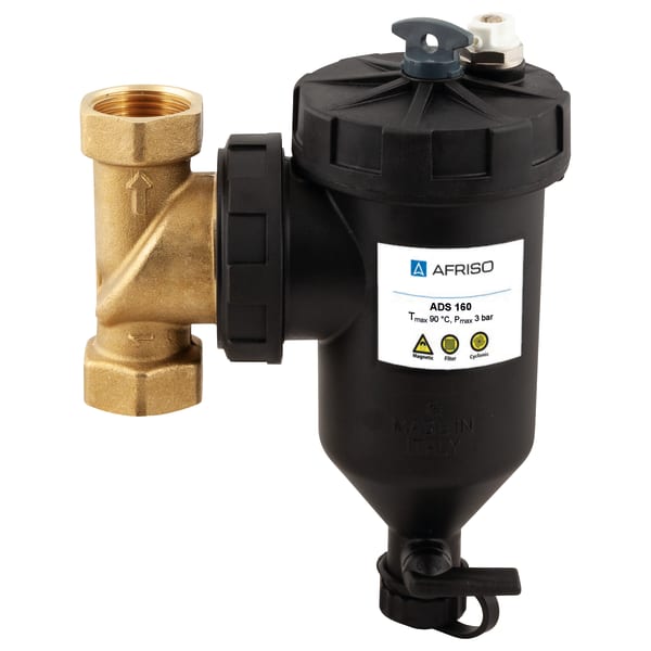 Compact sludge separator with drain valve and magnetite insert and optional form-fit heat insulation. When the system water flows into the separator, it starts to swirl. This causes a cyclonic movement of the medium, causing impurities to separate and settle in the lower part of ADS 160. There, metallic particles are attracted by a strong magnet. Other, non-metallic particles are removed by a 500 µm stainless steel sieve. The collected impurities can be easily removed via the drain valve. A manual vent is integrated in the cover; it can be replaced by an optional plastic G½ quick air vent. The mounting tool allows you to easily disassemble the sludge separator for thorough cleaning. Accessories include an additional stainless steel sieve with a greater mesh size, an anti-tamper seal to secure the magnet and spare O rings.