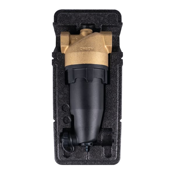 Compact sludge separator with drain valve and magnetite insert. When the system water flows into the separator, metallic particles such as rust or metal chips are removed by a strong magnet. Other, non-metallic particles are removed by a 800 µm stainless steel sieve. Collected impurities can be removed quickly via the integrated drain valve. The upper part of the housing contains a connection thread G½ which is closed by a cap. This is provided for connection of an optional quick air vent. The mounting tool included in the scope of delivery allows you to easily disassemble the sludge separator for thorough cleaning.