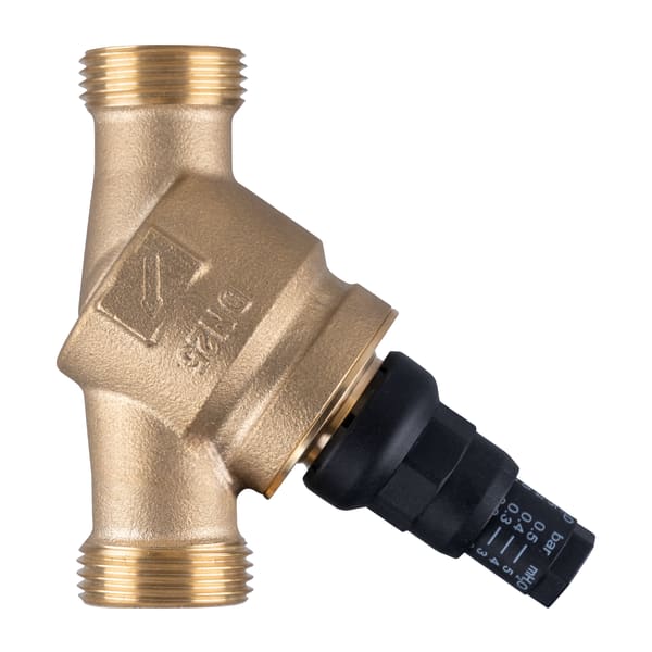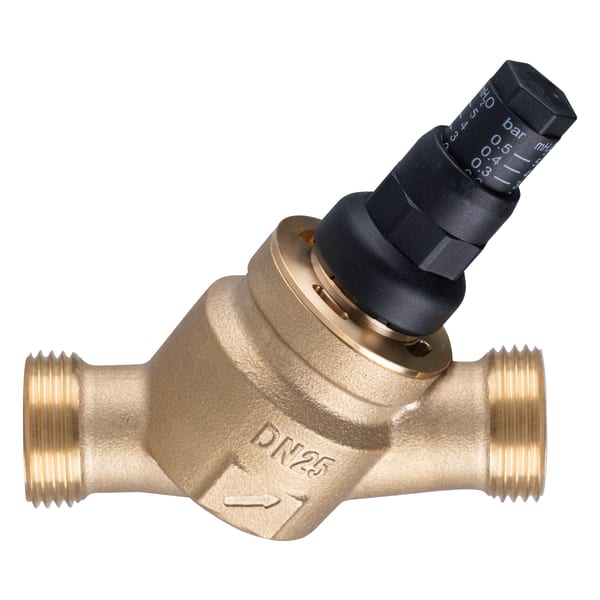Differential pressure bypass valve with directly readable adjustment scale. Housing made of brass. Available as straight version or angled version for space-saving installation.