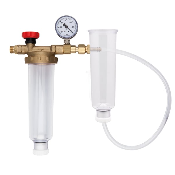 The tester for "safety-related equipment against siphoning" allows to quickly come to a sound conclusion concerning the correct operation of anti-siphon valves. Mounting is simple: Screw the filter cup of the tester into the fuel oil filter of the facility (not necessary in the case of oil filter cups with test and drain system), plug the hose into the tester drain system, connect an oil suction pump to the other end of the tester and you are ready for testing. For the test, a vacuum must be generated which sucks in oil; the oil flows into the tester cup. The vacuum is maintained in the tester cup via the shut-off fitting and displayed by the pressure gauge. When no more oil flows into the tester cup, there is pressure equilibrium. The vacuum can now be read at the test pressure gauge; with a simple formula (hydrostatic pressure / pressure difference), you can determine whether the siphoning protection works.