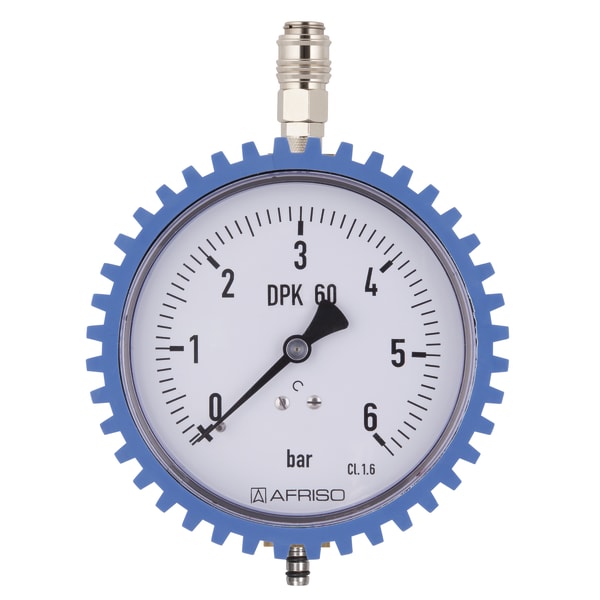 Leak test pressure gauge 0/6 bar with overpressure device and zero correction. Diameter 100 mm. Impact-protected housing.