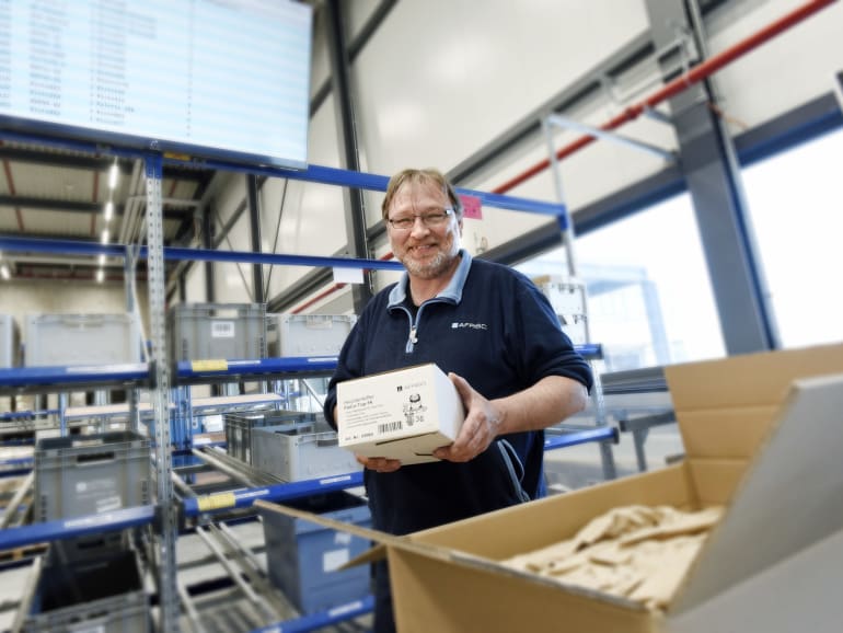 Logistics and service centre With a storage and logistics area of more than 3,750 m2 and a storage capacity of over 3,500 bin locations, the logistics and service centre, which went into operation in 2021, offers sufficient space for current and future requirements. Digitised processes Consistent digitalisation ensures lean, efficient workflows and speeds up daily processes. The SAP ERP system that is used across the entire corporation serves as a basis for this. In conjunction with specifically developed warehouse software, a high-performance and future-oriented system and process environment was created that meets the most modern requirements. Warehouse terminals guide our employees through the logistics centre, and „pick-by-light“ supports order picking. Distribution centre for national and international markets Maximum availability, short delivery times. As a distribution centre, the new building is used to ship AFRISO products all over the world. It operates in dual-shift operation six day a week in order to fully meet the demands of national and international customers in terms of short and reliable delivery times. Our range comprises more than 25,000 products. More than 3,000 of them are on stock; a total of more than 1,600,000 individual devices are available from stock.