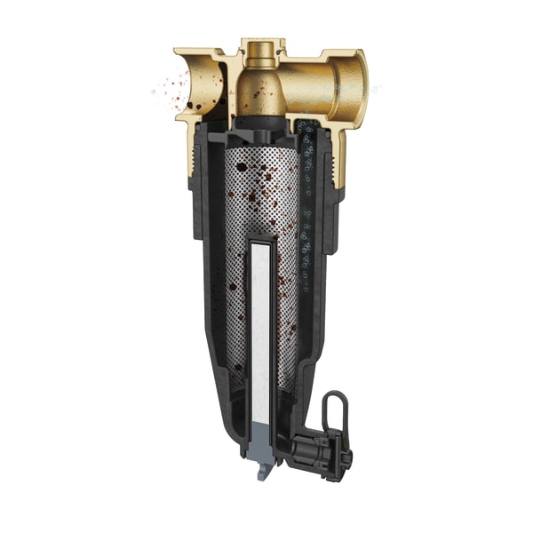 Kompakter Schlammabscheider mit Ablasshahn und Magnetiteinsatz. Dem Systemwasser werden beim Einströmen in den Abscheider metallische Partikel wie Rost oder Metallspäne durch einen starken Magnet entzogen. Andere nichtmetallischen Partikel werden vom 800-µm-Edelstahlsieb zurückgehalten. Über den integrierten Ablasshahn lassen sich die gesammelten Verunreinigungen einfach entfernen. Im Gehäuseoberteil befindet sich ein Anschlussgewinde G½, welches durch eine Kappe verschlossen ist. Optional kann dort ein automatischer Schnellentlüfter montiert werden. Mit Hilfe des im Lieferumfang enthaltenen Montagewerkzeuges kann der Schlammabscheider für eine intensive Reinigung einfach zerlegt werden.