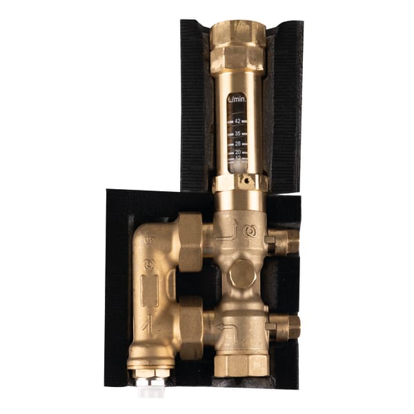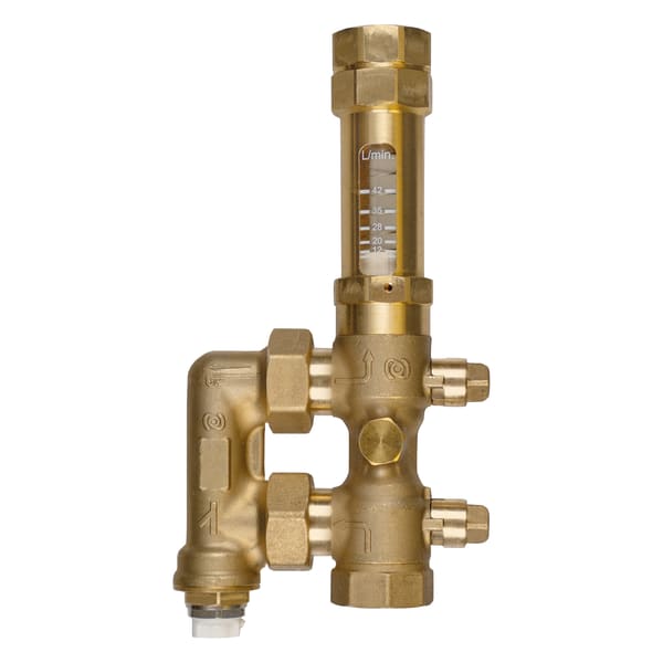Im laufenden Betrieb werden die Anschlüsse zur Aufnahme des Schlammabscheiders oder Filters verwendet. Dank der integrierten Kugelhähne können beide Anschlüsse zum Umbau und Reinigung sicher verschlossen werden. Der Durchflussmesser gibt Auskunft über den tatsächlichen Durchfluss.