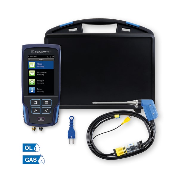 Bilder 1 Zurück Abgasmessgerät BLUELYZER C1 Basis Set | P00212 Abgasmessgerät BLUELYZER C1 Basis Set Lagerware Betriebsanleitung Benefits günstiges Einstiegs-Set, im kompakten Kofferausdauernde Performance mit über 20 Stunden Laufzeitdigitale Dokumentation und Bedienung per Appkompakter, vollwertiger SHK-Allrounder mit TFT-FarbmonitorAbgasanalyse, Druckmessung (Feinzug) und (Differenz-) Temperaturmessung mit nur einem Gerätrobustes, ergonomisches Gehäuse mit integrierten Magneten für freihändiges ArbeitenCO-Umgebungsmessung inklusive zwei frei einstellbarer Alarmschwellenvollwertiges Temperaturmessprogramm, auch Differenztemperaturen (z. B. Vorlauf/Rücklauf) können ermittelt werdenHold-Funktion: Kurzzeitige Messwertspeicherung im Monitor, Messung läuft im Hintergrund weiterMessprogramme und Messwerte frei editierbarSpeicherfunktion mit bis zu 100 MessprotokollenCAPBs®-fähig Anwendung Ideal für den Einsatz im SHK-Fachhandwerk zur genauen Einstellung oder Kontrollmessung auf Augenhöhe mit amtlichen Abgasmessgeräten. BLUELYZER C1 eignet sich zur Abgasanalyse, Druckmessung und (Differenz-)Temperaturmessung und ist das Handmessgerät für den universellen Einsatz an kleinen und mittleren Öl- und Gasfeuerungen sowie zur Überprüfung von Gasfeuerstätten auf CO-Konzentrationen. Das SHK-Multitalent verfügt zusätzlich über eine exakte Berechnung des Eta-Wertes für alle Brennwertheizungen mit brennstoffspezifischer Taupunktberechnung. Einsatzmedien Schnittstellen Zulassungen Technische Daten Downloads Ersatzteile Technische Daten Messbereiche (gemessene Werte)Luft-/Verbrennungslufttemperatur-20/+200 °CFeinzug-70/+70 hPaO2-Messung0/21 Vol.-%CO-Messungnominal: 0/2 000 ppmmaximal: 0/6 000 ppmweitere technische DatenAnzeige (berechnete Werte)CO2, COunverdünnt, Lambda, Taupunkt, Eta-Wirkungsgrad, Abgasverluste qA, CO mg/m3 (Erdgas), CO mg/kWh (Heizöl)TemperatureinsatzbereichUmgebung: 0/40 °CLagerung: -20/+50 °CGewicht (Messgerät)ca. 370 gMaßeB x H x T: 78 x 178 x 45 mmSchutzartIP 40 (EN 60529)DisplayTFT-Farbdisplay 3.5 "AnschlüsseFeinzug: ∅ 7 mmGas: ∅ 8 mmTemperatur: 2 x Buchse Typ KVersorgungsspannungLithium-Ionen-Akku (3.6 V/4800 mAh)Netzteil (USB-C)Akku- oder NetzbetriebBetriebszeitca. 20 StundenDatenspeicherunginterner Speicher für bis zu 100 MessprotokolleSchnittstellenInfrarot,Bluetooth®,QR-Code-Generator,USB-CZulassungenDIN EN 50379-2 für O2/CO2, TA, TG, Druck,DIN EN 50379-3 für COLieferumfangBLUELYZER C1 (O2, CO, Feinzug)KalibrierprotokollNetzteil NTE 5 USB-ALadekabel USB-A auf USB-C (1 m)5 x Partikelfilter5 x TeflonmembraneKondensatfilterpatrone KFP 2PAbgaskombisonde kompakt AKS-K 170 mmUmgebungsluftfühler TFB-UL 50-1Kleingerätekoffer Universal Downloads AFRISO_KOMPLETTPAKET-ABGASANALYSE_DEU_DEU_20260210_004826584.PDF Datenblätter Haustechnik PDF Englisch Deutsch Abgasmessgerät BLUELYZER C1 Betriebsanleitungen PDF Herunterladen Komplettpakete für die Abgasanalyse - Aktion Aktionsprospekte PDF Herunterladen Wartungsvertrag BLUELYZER C1 Wartungs- und Mietverträge PDF Herunterladen Ersatzteile Temperaturfühler Abb. Bezeichnung Umgebungsluftfühler TFB-UL 50-1 | 521844 Netzteile und Ladekabel Abb. Bezeichnung Netzteil NTE 5 USB-A | 523493 Ladekabel USB-A auf USB-C | 524697 Abgassonden Abb. Bezeichnung Abgaskombisonde kompakt AKS-K 170 mm mit Feinzuganschluss, mit Kondensatfilterpatrone KFP 2P | 500268-5 Kondensatfilterpatronen KFP Abb. Bezeichnung Kondensatfilterpatrone KFP 2P | 500192 Ersatzteilpaket Gasaufbereitung KFP 2P 5 x Partikelfilter, 5 x Teflonmembranen | 500214 Transportsysteme/Gerätekoffer Abb. Bezeichnung Kleingerätekoffer Universal mit Dokumentenfach | 511304