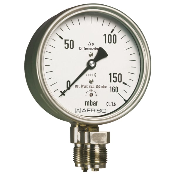 Bilder 2 KP100Dif D401 Kapselfeder-Standardmanometer für Differenzdruck Typ D4 Ausführungen Betriebsanleitung Video Benefits Messung kleinster Differenzdrückerobuste Ausführungstatische Drücke bis 400 mbardirekte Anzeige des Differenzdruckesviele kundenspezifische Ausführungen lieferbar Anwendung Zur Differenzdruckmessung bei nicht aggressiven gasförmigen, trockenen Medien. Besonders geeignet zur Filterverlustmessung in der Klima- und Lüftungstechnik.! Bei Medium Gas oder Dampf unbedingt Tabelle „Auswahlkriterien gemäß EN 837-2“ (s. Anhang) beachten! Ausführungen Technische Daten Technische Zeichnungen Downloads Video Ausführungen Gehäuse-⌀GehäuseGenauigkeitsklasseAnschlussAusrichtungAnzeigebereichTypArt.-Nr.KP100DifD401100 mmEdelstahl 3044,02 x G½B0/6 mbarKP100Dif D40135563401KP100DifD401100 mmEdelstahl 3044,02 x G½B0/10 mbarKP100Dif D40135564401KP100DifD401100 mmEdelstahl 3044,02 x G½B0/16 mbarKP100Dif D40135565401 Lagerware Fertigungsware Technische Daten TypD4Nenngröße100 - 100FunktionDer „Plus“-Druck (= hoher Druck) gelangt in das Innere der Kapselfeder. Der „Minus“-Druck (= niedriger Druck) gelangt in das Innere des druckdichten Gehäuses. Die so entstehende Druckdifferenz bewirkt eine Verformung der Kapselfeder und erzeugt den Messweg. Dieser wird auf das Zeigerwerk übertragen. Der Differenzdruck wird mit einem Zeiger direkt angezeigt.GenauigkeitsklasseEN 837-3/6≤ 0/16 mbar: 4,0Anzeigebereiche (EN 837-3/5)siehe BestelltabelleVerwendungsbereichruhende Belastung: Skalenendwertdynamische Belastung: 0,9 x SkalenendwertÜberdrucksicherheitSkalenendwertmaximaler statischer Druck400 mbarTemperatureinsatzbereichMedium: max. 60 °CUmgebung: -20/+60 °CTemperaturverhaltenAnzeigefehler bei Abweichung von der Normaltemperatur 20 °C am Messsystem:bei Temperaturzunahme ca. ± 0,6 %/10 K,bei Temperaturabnahme ca. ± 0,6 %/10 Kvom jeweiligen SkalenendwertSchutzartIP 66 (EN 60529) Standardausführung AnschlussEdelstahl 316 Ti/316 L: radial, parallel hintereinander2 x G½B, SW22 (EN 837-3/7.3)Messglied (mediumberührt)Kapselfeder, CuBe-LegierungZeigerwerk (mediumberührt)MessingNullpunktkorrekturfrontseitigDichtung (mediumberührt)NBR (Perbunan)Zifferblatt (mediumberührt)Aluminium, weißSkalierung schwarzZeiger (mediumberührt)Aluminium, schwarzGehäuse (mediumberührt)Edelstahl 304BajonettringEdelstahl 304Sichtscheibe (mediumberührt)Kunststoff (PMMA) Technische Zeichnungen Für Detailansichten, Zusatzinformationen und Maßtabellen bitte auf das jeweilige Bild klicken. NG 100/160 – Anschluss radial Maße (mm)NGabcD1D2e1GhsSW100164931019932G½B8620221601649316115932G½B1182022 Downloads Montage Manometer Betriebsanleitungen Industrietechnik PDF Herunterladen Rohrfeder-, Kapselfeder-, Plattenfeder-, Membranfedermanometer für Differenzdruck Betriebsanleitungen Industrietechnik PDF Ukrainisch Deutsch Deutsch AFRISO_EU-KONFORMITAETSERKLAERUNG_DRUCKGERAETE_DE.PDF Prüfbescheiningungen Industrietechnik PDF Herunterladen Video