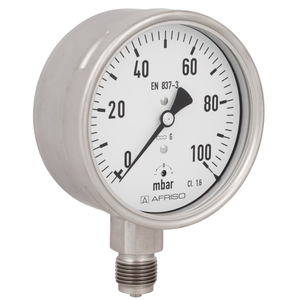 Bilder 5 KP160Ch D402 Kapselfeder-Chemiemanometer Typ D4 Ausführungen Betriebsanleitung Video Info Gehäuse-⌀ (Nenngröße)160 mmAnschlussG½BAusrichtungradialGenauigkeitsklasse1,6NormEN 837-3 Benefits mit Nullpunktkorrekturrobustes Edelstahlgehäuse (mit Bajonettring)mediumberührte Teile und Zeigerwerk aus EdelstahlGOSSTANDART-zertifiziertEx-Ausführung (optional) Anwendung Für gasförmige, trockene und aggressive Medien, auch in aggressiver Umgebung. Ausführungen Technische Daten Technische Zeichnungen Downloads Optionen Video Ausführungen AnzeigebereichEinbauartTypArtikelnummer-25/0 mbardirektKP160Ch D40235154402-40/0 mbardirektKP160Ch D40235155402-60/0 mbardirektKP160Ch D40235156402-100/0 mbardirektKP160Ch D40235157402-160/0 mbardirektKP160Ch D40235158402-250/0 mbardirektKP160Ch D40235159402-400/0 mbardirektKP160Ch D40235160402-600/0 mbardirektKP160Ch D40235161402-1 000/0 mbardirektKP160Ch D402351624020/25 mbardirektKP160Ch D402351664020/40 mbardirektKP160Ch D402351674020/60 mbardirektKP160Ch D402351684020/100 mbardirektKP160Ch D402351694020/160 mbardirektKP160Ch D402351704020/250 mbardirektKP160Ch D402351714020/400 mbardirektKP160Ch D402351724020/600 mbardirektKP160Ch D402351734020/1 000 mbardirektKP160Ch D40235174402 Lagerware Fertigungsware Technische Daten TypD4Nenngröße160 - 160Genauigkeitsklasse (EN 837-3/6)1,6Anzeigebereiche (EN 837-3/5)siehe BestelltabelleVerwendungsbereichruhende Belastung: Skalenendwertdynamische Belastung: 0,9 x SkalenendwertÜberlastsicherheit: 1,3 x SkalenendwertTemperatureinsatzbereichMedium: max. 100 °CUmgebung: -20/+60 °CTemperaturverhaltenAnzeigefehler bei Abweichung von der Normaltemperatur 20 °C am Messsystem:bei Temperaturzunahme ca. ± 0,6 %/10 K,bei Temperaturabnahme ca. ± 0,6 %/10 Kvom jeweiligen SkalenendwertSchutzartIP 32 (EN 60529) Standardausführung AnschlussEdelstahl 316 Ti/316 L, radialMessgliedKapselfeder, Edelstahl 316 Ti/316 LZeigerwerkEdelstahlNullpunktkorrekturfrontseitigDichtungFKM (Viton)ZifferblattAluminium, weißSkalierung schwarzZeigerAluminium, schwarzGehäuseEdelstahl 304BajonettringEdelstahl 304SichtscheibeD402: Sicherheitsverbundglas Technische Zeichnungen Für Detailansichten, Zusatzinformationen und Maßtabellen bitte auf das jeweilige Bild klicken. Anschluss radial Maße (mm)NGab∅cc1c2GhSW6310,8405213G¼B531410015,6496320G½B862216017,5506320G½B11622 Downloads ATEX Bescheinigung Manometer Zertifikate / DIBt-Zulassungen Industrietechnik PDF Englisch Deutsch AFRISO_EU-KONFORMITAETSERKLAERUNG_DRUCKGERAETE_DE.PDF Prüfbescheinigungen Industrietechnik PDF Herunterladen Montage Manometer Betriebsanleitungen Industrietechnik PDF Herunterladen Rohrfeder-, Kapselfeder-, Plattenfeder-, Membranfedermanometer für Differenzdruck Betriebsanleitungen Industrietechnik PDF Ukrainisch Deutsch Deutsch KP160CH_D402_351XX402.STP STEP 3D Modell Industrietechnik STP Herunterladen Optionen Optionen für Kapselfeder-Manometer Abb. Bezeichnung Drosselschraube Edelstahl 316 Ti NG 160 Bohrung wahlweise 0,3 – 0,5 – 0,7 mm (bitte angeben) | 38106 3-Lochfrontflansch Edelstahl 304 poliert NG 160 | 37610 Befestigungsrand hinten Edelstahl 304 trowalisiert NG 160 | 38051 Bajonettring Edelstahl 304 poliert NG 160 | 38055 Gehäuse Edelstahl 304 poliert NG 160 | 37614 rote Markierung auf Zifferblatt NG 160 | 38187 1 Markenzeiger rot NG 160 DK von außen verstellbar mit Drehknopf | 38191 Sichtscheibe Sicherheitsverbundglas NG 160 | 38075 besondere Einbaulage NG 160 | 38150 Mediumberührte Teile öl- und fettfrei gereinigt NG 160 Aufdruck „öl- und fettfrei“ | 37618 Klischeeerstellung je Skala und Farbe NG 160 Skalengestaltung nach EN 837-1, andere auf Anfrage | 38156 Zusatzfarbe NG 160 | 38168 3-Lochfrontflansch (Bajonett) Edelstahl 304 poliert NG 160 zur werkseitigen Montage | 38057 Video
