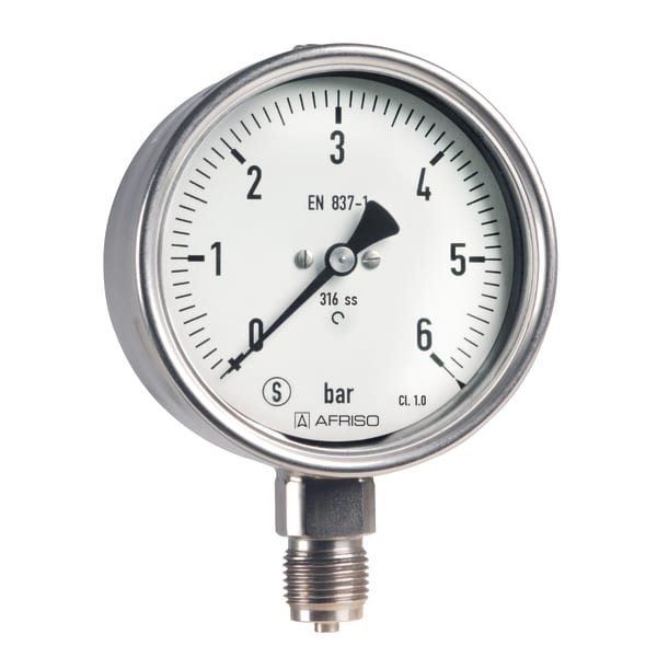 Bilder 3 RF100Si D402 Rohrfeder-Sicherheitsmanometer Typ D4 Ausführungen Betriebsanleitung Video Info Gehäuse-⌀ (Nenngröße)100 mmAnschlussG½BAusrichtungradialGenauigkeitsklasse1,0NormEN 837-1 Benefits Sicherheitsgehäuse S3 nach EN 837-1/9.7.2voll verschweißtes Messsystemmit Helium dichtheitsgeprüftDNV- und GOSSTANDART-zertifiziertEx-Ausführung (optional) Anwendung Für gasförmige und flüssige, aggressive, nicht hochviskose und nicht kristallisierende Medien, auch in aggressiver Umgebung. Für Anwendungsfälle nach Anforderungen gemäß EN 837-1/9.7.2. Ausführungen Technische Daten Technische Zeichnungen Downloads Video Ausführungen AnzeigebereichEinbauartTypArtikelnummer-1/0 bardirektRF100Si D40285451402-1/0.6 bardirektRF100Si D40285452402-1/+1.5 bardirektRF100Si D40285453402-1/+3 bardirektRF100Si D40285454402-1/+5 bardirektRF100Si D40285455402-1/+9 bardirektRF100Si D40285456402-1/+15 bardirektRF100Si D402854574020/0.6 bardirektRF100Si D402854594020/1 bardirektRF100Si D402854604020/1.6 bardirektRF100Si D402854614020/2.5 bardirektRF100Si D402854624020/4 bardirektRF100Si D402854634020/6 bardirektRF100Si D402854644020/10 bardirektRF100Si D402854654020/16 bardirektRF100Si D402854664020/25 bardirektRF100Si D402854674020/40 bardirektRF100Si D402854684020/60 bardirektRF100Si D402854694020/100 bardirektRF100Si D402854704020/160 bardirektRF100Si D402854714020/250 bardirektRF100Si D402854724020/400 bardirektRF100Si D402854734020/600 bardirektRF100Si D402854744020/1 000 bardirektRF100Si D40285475402 Lagerware Fertigungsware Technische Daten TypD4Nenngröße100 - 100GenauigkeitsklasseEN 837-1/6NG 100: 1,0Anzeigebereiche (EN 837-1/5)siehe BestelltabelleVerwendungsbereichNG 100, NG 160ruhende Belastung≤ 600 bar: Skalenendwert> 600 bar: ¾ x Skalenendwertdynamische Belastung≤ 600 bar: 0,9 x Skalenendwert> 600 bar: ⅔ x Skalenendwertkurzzeitig≤ 600 bar: 1,3 x Skalenendwert> 600 bar: SkalenendwertTemperatureinsatzbereichMedium: max. 100 °CUmgebung: -20/+60 °CSchutzartIP 54 (EN 60529) Standardausführung AnschlussEdelstahl 316 L, radialMessgliedRohrfederEdelstahl 316 Ti/316 L≤ 60 bar: Kreisformfeder> 60 bar: Schraubenformfederdichtheitsgeprüft mit HeliumZeigerwerkEdelstahlZifferblattAluminium, weißSkalierung schwarzZeigerAluminium, schwarzGehäuseEdelstahl 304, mit bruchsicherer Trennwand und ausblasbarer Rückwand (S3)BajonettringEdelstahl 304SichtscheibeSicherheitsverbundglas Technische Zeichnungen Für Detailansichten, Zusatzinformationen und Maßtabellen bitte auf das jeweilige Bild klicken. NG 100/160 – Anschluss radial Maße (mm)NGab∅cc1c2GhSW10027606320G½B862216040786320G½B11822 Downloads Rohrfeder-Manometer Katalog-Optionen Haustechnik PDF Englisch Deutsch Auswahlkriterien und Sicherheitsaspekte für Druckmessgeräte nach EN 837-2 Technische Information PDF Englisch Deutsch AFRISO_EU-KONFORMITAETSERKLAERUNG_DRUCKGERAETE_DE.PDF Prüfbescheiningungen Industrietechnik PDF Herunterladen Montage Manometer Betriebsanleitungen Industrietechnik PDF Herunterladen Rohrfeder-, Kapselfeder-, Plattenfeder-, Membranfedermanometer für Differenzdruck Betriebsanleitungen Industrietechnik PDF Ukrainisch Deutsch Deutsch RF100SI_D402_854XX402.STP STEP 3D Modell Industrietechnik STP Herunterladen ATEX Bescheinigung Manometer Zertifikate / DIBt-Zulassungen Industrietechnik PDF Englisch Deutsch Video