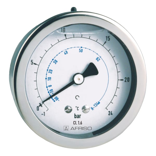 Bilder 2 RF63KTGly D711 Rohrfeder-Standardmanometer für die Kältetechnik Typ D7 mit Glyzerinfüllung Ausführungen Betriebsanleitung Video Info Gehäuse-⌀ (Nenngröße)63 mmAnschluss7/16-20 UNFAusrichtungaxialGenauigkeitsklasse1,6 Benefits einsetzbar bei starken Vibrationen und hohen dynamischen Druckbelastungenlängere Lebensdauer durch geringeren Verschleiß und Korrosionsschutz des Messsystemsverschiedene Kältemittel messbar durch MehrfachskalenDNV- und GOSSTANDART-zertifiziert Anwendung Zur gleichzeitigen Messung von Dampfdrücken und -temperaturen in der Kältetechnik.! Bei Medium Gas oder Dampf unbedingt Tabelle „Auswahlkriterien gemäß EN 837-2“ (s. Anhang) beachten! Ausführungen Technische Daten Technische Zeichnungen Downloads Video Ausführungen AnzeigebereichEinbauartTypArtikelnummer-1/+9 bardirektRF63KTGly D71185130711-1/+12.5 bardirektRF63KTGly D71185131711-1/+15 bardirektRF63KTGly D71185132711-1/+24 bardirektRF63KTGly D71185133711-1/+30 bardirektRF63KTGly D71185134711 Lagerware Fertigungsware Technische Daten TypD7Nenngröße63 - 63GenauigkeitsklasseEN 837-1/6NG 63: 1,6Anzeigebereiche-1/+9 barTemperaturskalenfür Kältemittel: R 134a,R 290,R 404A,R 407A,R 507,R 744Verwendungsbereichruhende Belastung: ¾ x Skalenendwertdynamische Belastung: ⅔ x Skalenendwertkurzzeitig: SkalenendwertTemperatureinsatzbereichMedium: gemäß KältemittelUmgebung: -20/+60 °CTemperaturverhaltenAnzeigefehler bei Abweichung von der Normaltemperatur 20 °C am Messsystem:bei Temperaturzunahme ca. ± 0,4 %/10 K,bei Temperaturabnahme ca. ± 0,4 %/10 Kvom jeweiligen SkalenendwertSchutzartIP 54 (EN 60529) bei Gehäuseentlüftung (≤ 25 bar) Standardausführung AnschlussMessing, axial7/16-20 UNFMessgliedRohrfeder, KupferlegierungKreisformfederZeigerwerkMessingZifferblattAluminium, weißDruckskalierung schwarzTemperaturskalierung farbigZeigerAluminium, schwarzGehäuseEdelstahl 304, mit DruckentlastungsöffnungBördelringEdelstahl 304SichtscheibeKunststoffFüllflüssigkeitGlyzerin (99,5 %) Technische Zeichnungen Für Detailansichten, Zusatzinformationen und Maßtabellen bitte auf das jeweilige Bild klicken. Anschluss axial Maße (mm)NGb∅cc1c2c3c4Dgg1GG1sSWSW16330,5521349,56853,555,5G¼B7/16-20 UNF714148033,5632049,58565,558,5G½B7/16-20 UNF7221410033,5632049,510665,558,5G½B7/16-20 UNF72214 Downloads Montage Manometer Betriebsanleitungen Industrietechnik PDF Herunterladen Rohrfeder-, Kapselfeder-, Plattenfeder-, Membranfedermanometer für Differenzdruck Betriebsanleitungen Industrietechnik PDF Ukrainisch Deutsch Deutsch AFRISO_EU-KONFORMITAETSERKLAERUNG_DRUCKGERAETE_DE.PDF Prüfbescheiningungen Industrietechnik PDF Herunterladen Video