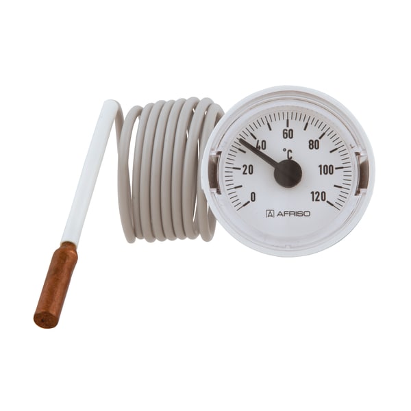 Bilder 2 THK 37 Thermometer mit Kapillarleitung Ausführungen Benefits ideal für Kessel und Warmwassererzeugerkorrosionsfestes, hochschlagfestes Kunststoffgehäuseviele kundenspezifische Ausführungen lieferbar Anwendung Heizung und Sanitär, z. B. Kessel, Warmwassererzeuger, Pufferspeicher. Ausführungen Technische Daten Ausführungen NenngrößeNenngrößeGehäuseÜbersteckringZeigerZifferblattSkalaAnzeigebereichKapillarlängeTypArt.-Nr.37 mmgrauschwarzweißschwarz0/120 °C500 mmTHK 376751210537 mmgrauschwarzweißschwarz0/120 °C1000 mmTHK 376751211537 mmgrauschwarzweißschwarz0/120 °C1500 mmTHK 376751212537 mmgrauschwarzweißschwarz0/120 °C2000 mmTHK 3767512135 Lagerware Fertigungsware Technische Daten Nenngröße37 - 37Anzeigebereich0/120 °CGenauigkeit/Prüfpunkt 50 °C = 3 °CMessprinzipFlüssigkeitsfüllungTemperatureinsatzbereichMedium: SkalenendwertUmgebung: max. 70 °CBetriebsdruckdrucklosSchutzartIP 32 (EN 60529) Standardausführung AnschlussFühler: ∅ 6 x 30 mm, KupferKapillarleitung: Kupfer mit PVC-Mantel (R3, grau)ZifferblattKunststoff, weißSkalierung schwarzZeigerKunststoff, schwarzGehäuseKunststoff (ABS), grauRingTHK 37: