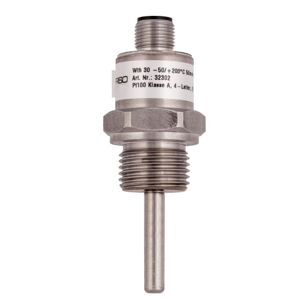 Bilder 2 WTh 30 Widerstandsthermometer Ausführungen Betriebsanleitung Video Benefits hygienisches Design nach den Empfehlungen der EHEDGkompakte Bauformhohe Genauigkeitkurze Ansprechzeitverschiedene Prozessanschlüsseintegrierbarer Messumformer Anwendung Für Temperaturmessungen in Behältern oder Rohrleitungen, bei denen hygienische Prozessanschlüsse, hygienegerechte Werkstoffe und Verarbeitung gefordert werden. Durch die kompakte Bauform und die hohe Genauigkeit besonders geeignet für die Lebensmitteltechnik, Pharmazie und Biotechnologie. Beschreibung WTh 30 besteht aus einem robusten Edelstahlgehäuse mit verschiedenen Prozessanschlüssen und einem Pt 100 Messeinsatz, der direkt in ein Schutzrohr integriert ist. Die von der Messtemperatur abhängige Widerstandsänderung kann direkt abgegriffen oder optional von einem eingebauten Messumformer erfasst und in ein 4–20 mA Ausgangssignal gewandelt werden. Der elektrische Anschluss erfolgt über eine kompakte M 12 Steckerverbindung. Ausführungen Technische Daten Downloads Video Ausführungen EinbaulängeArt.-Nr.Widerstandsthermometer WTh 3030 mm32302Widerstandsthermometer WTh 3035 mm32303Widerstandsthermometer WTh 3050 mm32304Widerstandsthermometer WTh 30100 mm32305Widerstandsthermometer WTh 30150 mm32306Widerstandsthermometer WTh 30200 mm32307 Lagerware Fertigungsware Technische Daten Sensor1 x Pt1004-LeiterKlasse A, IEC 751Schutzrohr∅ 6Edelstahl 316 LProzessanschlussG½BEdelstahl 316 LEinbaulänge30 mmelektrischer AnschlussSteckerverbindung M12Steckergehäuse: EdelstahlGehäuseWerkstoff: EdelstahlDurchmesser: 18 mmSchutzartIP 67 (EN 60529)OberflächenrauheitRa: < 0.8 µmSchweißnaht: < 1.6 µmBetriebsdruckmax. 16 barMessbereich-50/+200 °CAnsprechzeit t90 5.5 s gemäß EN 60751, Prüfung in fließendem Wasser (ohne Messumformer) Downloads Widerstandsthermometer WTh 30 Konformitätserklärungen PDF Herunterladen Video