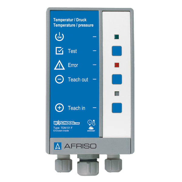 Images 2 Back TDM 51 F | 78089 temperature and pressure measuring instrument in-stock items Documents Benefits ideal for measuring a great variety of values and parameters in domestic technology applicationsPressure and temperature sensors can be connectedintegrated mains voltage monitoringEnOcean®-insideEEP (EnOcean® Equipment Profile): Generic Profile (GP) Application For measuring pressure and temperature in domestic technology applications such as filling pressure in the heating system, level in fuel oil tanks or cisterns, layer temperature in hot water storage tanks or system temperatures (e.g. flow, return). Description The temperature and pressure measuring instrument TDM 51 F features five inputs for Pt-1000 temperature sensors and an RS-485 Modbus connection for digital temperature sensors. The measured data is transmitted to the AFRISOhome gateway HG 01 via an integrated EnOcean® wireless module. The measured data is visualised on the AFRISOhome application. If the measured value is out of range, groups of persons (e.g. owner or janitor) can be notified selectively. TDM 51 F monitors the mains voltage and sends an alarm message in the case of a power outage. EnOcean® wireless technology allows for integration into building control systems. Technical data Downloads Accessories Spare parts Technical data Operating temperature rangeAmbient: -5/+55 °CStorage: -10/+60 °CSupply voltageAC 100 − 240 VNominal power 5 VAHousingWall mounting housing made of impact-resistant plastic (ABS)W x H x D: 100 x 188 x 65 mmWeight: 430 g Degree of protection: IP 40 (EN 60529)inputs5 x Pt 1000 (2-wire)1 x Modbus RTU (RS 485)Measuring rangetemperature: -100/+300 °Cpressure: depending on sensor usedAccuracytemperature: ± 0.5 Kpressure: depending on sensor usedEnOcean® wirelessEEP: Generic Profile (GP)Frequency: 868.3 − MHzTransmission power: max. 10 mWRange: 10 − 30 mRange: depending on room arrangement and materials in the buildingScope of deliverycontrol unit with EnOcean® wireless module Downloads Temperatur- und Druckmessgerät TDM 51 F Manuals PDF Download Accessories Mounting accessories Abb. Bezeichnung Dichtungsrahmen IP 54 | 43416 mounting frame | 43521 Montageset WATCHDOG Warngeräte | 43100 Spare parts Function extensions Abb. Bezeichnung TCM 320 | 78082