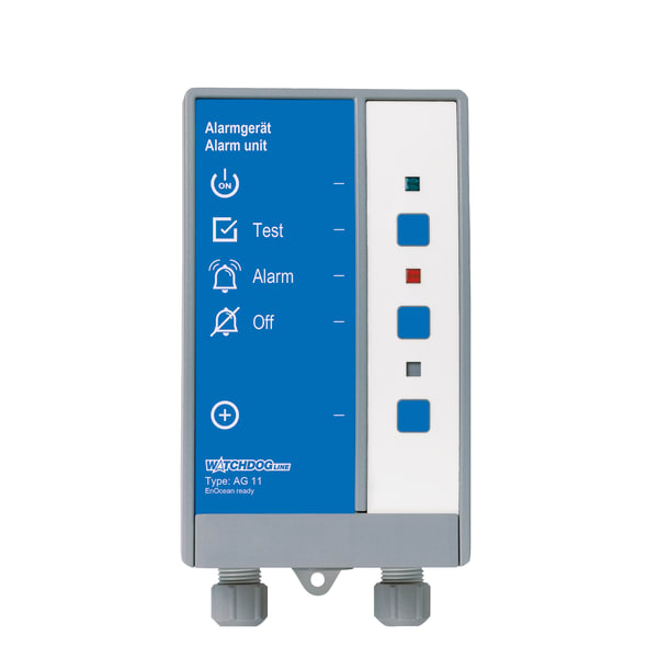 Images 1 AG 11/12 Alarm unit Variants Documents Benefits with visual/audible alarms, Test and Acknowledge buttonsRelay output for event reporting systemshigh (planning) reliability due to timely alarm or status information of system components to be monitored Application For visual and audible alarms or transmission of signals from connected signal transmitters, e.g. pressure gauges with electrical contacts, pressure transducers, limit switches, boiler water low level alarms in heating systems, AFRISO WATCHDOG-LINE alarm units and other switching equipment. Description Alarm unit in wall mounting housing with visual/audible alarms, Acknowledge keys and relay output. A green LED indicates normal operation. The alarm signal is generated by the connected signal transmitter. In the case of an alarm, the red LED lights up; in addition, the system generates an audible alarm. The audible alarm can be muted with the Acknowledge key. The visual alarm is cleared once the event has been removed. The Test key allows you to simulate an alarm condition in order to perform a function test. The voltage-free relay contacts allow for connection of additional external signalling equipment (such as a horn), event reporting systems, building control systems or similar equipment.Version AG 11:For connection of signal transmitters and equipment with one voltage-free normally closed contact such as the boiler water low level alarm WP 6. AG 11 features one voltage-free changeover contact. AG 11 features two operating modes: In the operating mode "Eco" (factory default), the relay is de-energised when no alarm is active. In case of an alarm, the relay is energised. In the operating mode "FailSafe", the relay is energised when no alarm is active. In case of an alarm, the relay is de-energised. This way, an alarm can also be triggered in the case of a power outage.Version AG 12:For connection of signal transmitters and equipment with one voltage-free normally open contact such as the pressure gauge with electrical contact RF 63 MK1 D302. AG 12 features two voltage-free changeover contacts one of which can be reset with the Acknowledge key. EnOcean®-ready: Both alarm units can be integrated into the AFRISO smart home system or other smart home systems based on EnOcean® wireless by means of the optional wireless module TCM 320. This allows for additional push messages to smartphones or via e-mail (further accessories required).The alarm units AG 11 / AG 12 are suitable for panel mounting with a mounting frame. A sealing kit (IP 54) is available for rough application conditions. Variants Technical data Downloads Accessories Variants Part no.Alarm unit AG 1167030Alarm unit AG 1267031 in-stock items manufactured goods Technical data Operating temperature rangeAmbient: -5/+55 °CStorage: -10/+60 °CPower inputAG 11: 5 VASwitching inputvoltage-free connectionSwitching outputRelay contactAG 11: 1 x voltage-free changeover contactContact rating: max. AC 250 V, 2 AOperating modesAG 11: Eco/FailSafeAlarm soundmin. 70 dB(A), A-weighted sound level of the audible alarm at a distance of one metreResponse delay< 1 secondHousingWall mounting housing made of impact-resistant plastic (ABS)W x H x D: 100 x 188 x 65 mmWeight: 0.5 kgDegree of protection: IP 30 (EN 60529)Scope of deliveryAlarm unitMontagezubehörCable gland for connection of additional equipmentOptionEnOcean® wireless module TCM 320 (can be retrofitted) Downloads Alarmgerät AG 11, AG 12 Manuals PDF Download Alarmgerät AG 11, AG 12 PDF Download Accessories Accessories and spare parts for level sensors, overfill prevention systems and level controllers Abb. Bezeichnung KVA | 40041 Mounting accessories Abb. Bezeichnung Dichtungsrahmen IP 54 | 43416 mounting frame | 43521 Montageset WATCHDOG Warngeräte | 43100 Function extensions Abb. Bezeichnung TCM 320 | 78082