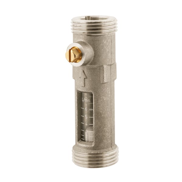 Images 1 Back Flow meter DFM 15-2M | 80959 Flow meter DFM 15-2M manufactured goods Documents Benefits integrated ball valve for adjustment and shutting offdirect indication of the flow rate in l/minadjustment without diagram, table or measuring instrumentavailable with many connection types Application For hydraulic balancing and flow monitoring in heating/cooling systems, air conditioning systems, solar systems and geothermal systems. DFM allows for fast hydraulic balancing of the system or of system components without diagrams, tables or measuring instruments. Suitable for heating and cooling water as well as water mixtures with standard corrosion protection and antifreeze agents. Description Compact flow meter with scale and ball valve for shutting off and adjustment. The flow meter can be installed in pipes in a horizontal, tilted or vertical position. Adjustments are made by means of a screwdriver via the adjustment screw. The reading mark corresponds to the lower edge of the rotameter/float. Systems with correct hydraulic balancing provide for optimum energy distribution and cost-efficient operation. Technical data Downloads Technical data Operating temperature rangemax. 120 °C, short-term 160 °COperating pressuremax. 10 barMeasuring principleRotameter type with counter springMeasuring rangesee ordering tableNominal diameterDN 15HousingBrass, nickel-platedConnectionG1 male x G1 maleMounting positionhorizontal, tilted or verticalOptionsother nominal diametersandere Anschlüsseother measuring ranges Downloads Durchflussmesser DFM Manuals PDF Download