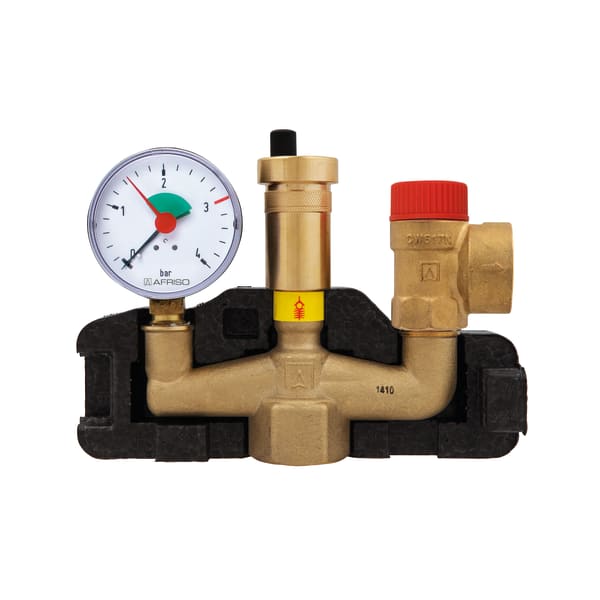 Images 2 Back KSG Maxi | 77581 Boiler safety group assembly in-stock items Documents Benefits compact version in form-fit insulationtime-saving installation with pre-assembled, tightness-tested assemblyVent chamber for collecting and separating the air and the water in the heating systemQuick air vent PrimoVent with two-way venting principle for automatic ventingpressure gauge for heating installations for direct indication of the system pressuresafety valve for protection against overpressureService-friendly: Quick air vent can be replaced without drainingfor heating systems with a capacity of up to 100 kW Application For sealed heating systems as per EN 12828 with a capacity of up to 100 kW. Description Complete, pre-assembled, tightness-tested boiler safety group assembly. Consisting of carrier, pressure gauge for indicating the system pressure, quick air vent with aqua stop and diaphragm safety valve MS, in form-fit heat insulation. With self-sealing mounting valve for easy replacement of the quick air vent. Technical data Downloads Technical data connection boilerG1 femaleOperating temperature rangemax. 120 °CDimensionsW x H x D: 183 x 144 x 70 mmInsulationPolypropylene EPPCarrierBrassDiaphragm safety valve MSInlet x outlet: G¾ x G1Seal: PTFE sealing ring, can be rotatedResponse pressure: 3 barPressure gauges for heating installationsRange: 0/4 barDiameter: 63 mmConnection: G¼ bottomquick air vent with aqua stopInput: G⅜Nominal pressure: 12 bar Downloads Kesselsicherungsgruppe KSG, KSG Maxi Manuals PDF Download
