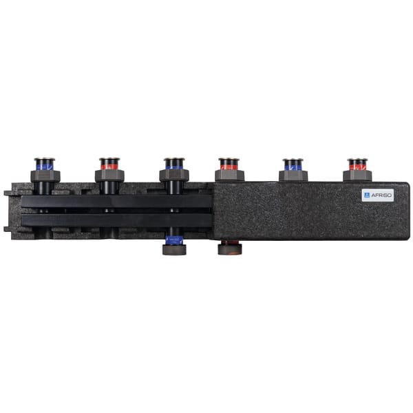 Wall mounting bracket boiler manifold Images 2 KSV 125 160kW Kesselverteiler für Heizungspumpengruppen PrimoTherm® Variants Documents Benefits compact and robust version in form-fit insulationfor two or three heating pump assemblies, with optional hydraulic separator2 wall mounting bracket for easy mounting includedAFRISO boiler manifolds are tightness-tested in the factory. Application For distribution of the heating circuit water in sealed heating systems as per EN 12828 from the boiler to the heating pump assemblies PrimoTherm®. Description Boiler manifold as combination flow and return manifold for two, three, four or five heating pump assemblies. AFRISO boiler manifolds are tightness-tested in the factory; they are maintenance-free. Variants Technical data Downloads Variants Heating circuitshydraulic separatorPart no.Boiler manifold KSV 125-2 160 kW2077319Boiler manifold KSV 125-3 160 kW3077320Boiler manifold KSV 125-4 160 kW4077321Boiler manifold KSV 125-5 160 kW5077322 in-stock items manufactured goods Technical data system connectionsboiler side 160 kW: threaded socket G2 malePump assembly 160 kW: union nut G1½, flat-sealingAxis distance 125 mmOperating temperature rangeMedium: max. 110 °CFlow 160 kW: 7 m³/hSystem pressuremax. 6 barHeat insulationPolypropylene EPPScope of deliveryBoiler manifold2 x WandkonsoleInsulation Downloads Kesselverteiler KSV 125 Manuals Domestic Technology PDF Download Kesselverteiler KSV 125 Manuals PDF Download
