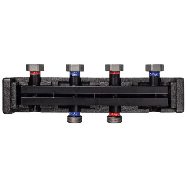 Wall mounting bracket boiler manifold Images 4 Back Boiler manifold KSV 125-2 160 kW | 77319 Boiler manifold KSV 125 for heating pump assemblies PrimoTherm® in-stock items Documents Benefits compact and robust version in form-fit insulationfor two or three heating pump assemblies, with optional hydraulic separator2 wall mounting bracket for easy mounting includedAFRISO boiler manifolds are tightness-tested in the factory. Application For distribution of the heating circuit water in sealed heating systems as per EN 12828 from the boiler to the heating pump assemblies PrimoTherm®. Description Boiler manifold as combination flow and return manifold for two, three, four or five heating pump assemblies. AFRISO boiler manifolds are tightness-tested in the factory; they are maintenance-free. Technical data Downloads Technical data system connectionsboiler side 160 kW: threaded socket G2 malePump assembly 160 kW: union nut G1½, flat-sealingAxis distance 125 mmOperating temperature rangeMedium: max. 110 °CFlow 160 kW: 7 m³/hSystem pressuremax. 6 barHeat insulationPolypropylene EPPScope of deliveryBoiler manifold2 x WandkonsoleInsulation Downloads Kesselverteiler KSV 125 Manuals Domestic Technology PDF Download Kesselverteiler KSV 125 Manuals PDF Download