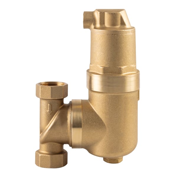Images 1 Back Luftabscheider G1 | 40919 in-stock items Documents Benefits Optimum separation of micro air bubblesextends the service life of the system and ensures optimum system efficiencymaintenance-free operationIdeal for large water volumes thanks to low pressure loss Application For removing air from heating systems. The air separator ensures reliable operation as well as better and faster heat transfer. Suitable for all types of hot water heating systems and underfloor heating systems. Description Compact air separator with integrated vent valve. When the system water flows through the air separator, air bubbles are effectively separated from the medium and collect in the venting area. When a certain amount of air is collected, the vent valve opens automatically and the air escapes. The air separator G1 is suitable for mounting in vertical and horizontal pipes. The connection piece (T piece) and the vent valve can be rotated by 360° around their axes. Technical data Downloads Technical data HousingBrassOperating pressuremax. 10 barOperating temperature rangeMedium: -10/+110 °CAmbient: 0/90 °CConnections2 x G1 femaleMounting positionhorizontal and vertical Downloads Luftabscheider Manuals PDF Download