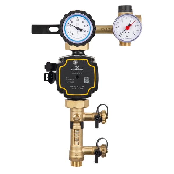Products Our motto "Technology for Environmental Protection" has long been an inherent part of our product development philosophy and product range. We strive to improve the environment, to make processes which work with greater environmental compatibility and to avoid putting a strain on the environment. We offer you a multitude of innovative solutions, new products and smart concepts. More Informations Industries & Topics Industries & Topics Overview Fuel oil components Fuel oil components Overview Fast and clean oil filter change Avoiding fungal attacks in biofuel More performance with the sintered plastic sieve AFRISO Smart Home AFRISO Smart Home Overview Gateway HG 02 Products Products Overview AFRISOhome App Alexa Smart home applications Smart home applications Overview Leakage security Security Stand-alone applications Stand-alone applications Overview Getting started with AFRIShome Smart Home Craft 4.0 Craft 4.0 Overview OEM-Manifold systems Hydraulic Balancing Hydraulic Balancing Overview VarioQ Vario-DP Tank conversion Hygienic processes AFRISO Smart Home AFRISO Smart Home offers innovative solutions for intelligent home automation. With modern sensors and actuators, you can easily and conveniently control your home. More Informations Service-Center Service-Center Overview Service Contact persons Data exchange formats Catalogs Service-Center Flexible, cost-aware, on schedule, solution-oriented and fast – the AFRISO team always provides the decisive added value. More Informations Training & Events Training & Events Overview Exhibitions Exhibitions Overview SHK+E 2026, Essen IFH Intherm 2026, Nuremberg GET Nord 2026, Hamburg Schulungen & Trainings Schulungen & Trainings Overview Heizen mit flüssigen Brennstoffen Inhouse-Schulung - Heizen mit flüssigen Brennstoffen Inhouse-Schulung Heizölverbraucheranlagen Smart Home Experte Search Domestic technology Equipment for heating systems, boiler rooms and chimneys 77886 PrimoSol 130-1 Insulation 130-1 and 130-4 The insulation is also used to package the product for protected transport Images 3 Back PrimoSol®130-1 | 77886 Solar pump line in-stock items Documents Benefits pre-assembled, tightness-tested and heat-insulated assemblyIntegrated filling and flushing uniteasy, fast mountingmaximum reliabilityErP-ready: Electronics with increased energy efficiency reduces negative impact on the environment Application Solar pump assembly/line for connection of collector and storage tank in intrinsically safe, sealed solar thermal systems. PrimoSol® 130 circulates heat transfer fluids such as water/glycol mixtures in the system. Description Complete, pre-assembled and tightness-tested solar pump assembly/line with all required safety and functional components, including form-fit heat insulation.Depending on the version, the return line (return/cold) consists of:Circulation pumpFlow meter with ball valve for shut-off, pump end with flange and union nut G1½. Measuring range: 2–12 l/min. With integrated filling and flushing unit, system connection: G¾ male thread.Combination valve with system connection G3/4 male thread, pump end with flange and union nut G1½. With adjustable gravity brake and thermometer in the hand wheel (blue mark, range 0/120 °C).Safety group assembly with connection G¾ for expansion vessel. With solar safety valve 6 bar, outlet Rp¾ female thread, pressure gauge Ø 63 mm, 0/10 bar, mounting valve.The flow line consists of (130-4 only):Combination valve with adjustable gravity brake and thermometer in the handle (red mark, range 0/120 °C) with system connection G3/4 male threadVent pot to remove the gas from the heat transfer fluid with system connection G¾ male. Transparent hose 200 mm as venting aid.The heat insulation is also used to package the product for protected transport. The safety valve of the safety group assembly complies with Pressure Equipment Directive 2014/68/EC. Technical data Downloads Technical data Axis distance 100 mmsystem connectionsG¾ maleOperating temperature rangeAmbient: max. 40 °CMedium: max. 120 °CMedium: short-term 160 °CSystem pressuremax. 6 barmax.Flow meter 2 − 12 l/minInsulationPolypropylene EPPCirculation pumpGrundfos UPM 3 Solar 25-75Length: 130 mmDegree of protection: IP 42 (EN 60529)Supply voltageAC 230 V, 50 HzPower input/pumping head19 W/4.5 m28 W/5,5 m35 W/6.5 m45 W/7,5 m Downloads Solarpumpengruppe PrimoSol 130 Manuals PDF Download Related products