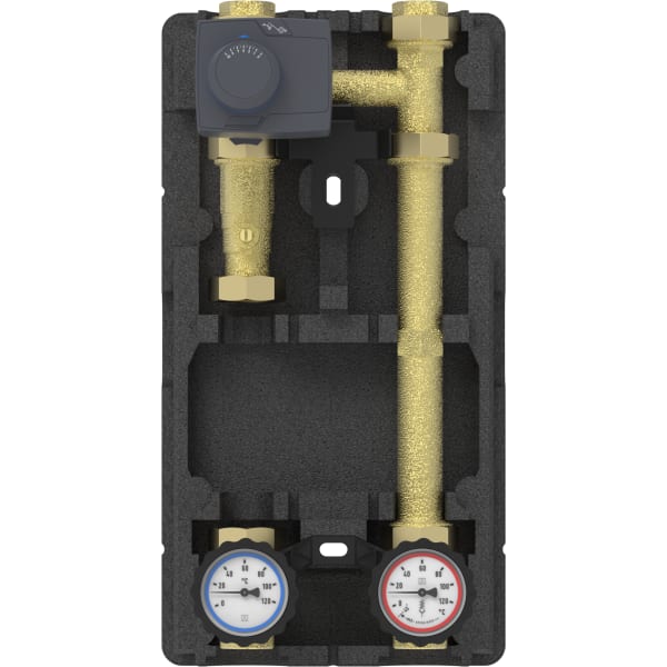 Images 1 Back PrimoTherm® 180-2 DN25 RTA | 77304 Heating pump assembly in-stock items Documents Benefits pre-assembled and tightness-tested assemblyhigh-grade, robust mixervirtually any standard pump can be installed without reworking of the insulationeasy, fast mountingsophisticated wall mounting kitcable routing integrated in insulation Application Heating pump assembly for use in mixed heating circuits. With the 3-way mixer and the actuator, the flow temperature can be adjusted to a desired temperature by adding water from the return. The new mixer with adjustable flow coefficient Kvs offers the HVAC professional maximum flexibility in adapting the system to individual control requirements. The flow coefficient Kvs can be modified at any later point in time, even if the system is under pressure. This way, a great variety of mixer/pump assemblies can be covered with a single version. PrimoTherm® 180-2 is also available as version RTA. It can be used to increase the return temperature with solid fuel burners which have a controller for increasing the return temperature. Description Complete, pre-assembled and tightness-tested heating pump assembly with all required functional components, form-fit insulation.The flow line consists of:Combination valve with thermometer in the hand wheel (red mark, range 0/120 °C)Ball valve below the pump3-way mixing valve ARV 325 KVS Vario with adjustable flow coefficient Kvs and ProClick adapter systemMaintenance-free, silent actuator ARM 343 (6 Nm, 120 s, AC 230 V) with 0/90° angle of rotation, indication for direction of rotation, selector key "Manual/Automatic Mode" and ProClick adapter systemSystem connection G1½ male (boiler), G1 female (heating circuit). Suitable for pumps DN 25 with G1½ x 180 mm.The return line consists of:Combination valve with gravity brake, thermometer in the handle (blue mark, range 0/120 °C)Pipe for length compensation with screw connectionT piece for mixer connectionSystem connection G1½ male (boiler), G1 female (heating circuit)Difference version RTAInterchanged colour codes of thermometers3-way mixer wit flow coefficient Kvs 12 m3/h (not adjustable)System connection (storage) with additional connection flanges G1 femaleAdditional mounting bracket for upside down or lateral mountingScope of delivery does not include pump Downloads Downloads Heizungspumpengruppe PrimoTherm® K 180-1 DN 25, K 180-2 DN 25 Manuals PDF Download