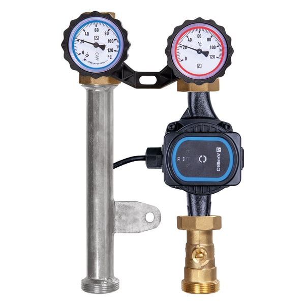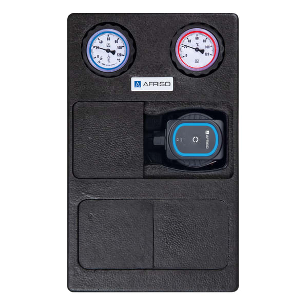 Images 3 Back PrimoTherm® K 180-1 DN25 | 79136 Heating pump assembly manufactured goods Documents Benefits pre-assembled, tightness-tested and heat-insulated assemblymodular system with flow at left or righteasy, fast mountingavailable with high energy efficiency pump class A Application Heating pump assembly for use in non-mixed heating circuits, specially for storage tank charging. It connects the heating boiler and the pipe system. Description Comact, pre-assembled and tightness-tested heating pump assembly with all required functional components, form-fit heat insulation (complies with German Energy Saving Regulation) and wall mounting unit. Adhesive labels with pictograms allow for easy designation of the heating circuits.The flow line consists of: Combination valve with thermometer in the hand wheel (red mark, range 0/120 °C)Ball valve below the pumpSystem connection G1½ male (boiler), G1 female (heating circuit) Suitable for pumps DN 25 with G1½ x 180 mm.The return line consists of:Combination valve with gravity brake, thermometer in the handle (blue mark, range 0/120 °C)Pipe for length compensation with screw connectionSystem connection G1½ male (boiler), G1 female (heating circuit) Technical data Downloads Technical data Axis distance 125 mmsystem connectionsBoiler: G1½ maleHeating circuit: G1 femaleOperating temperature rangeMedium: max. 95 °CMedium: short-term 120 °CSystem pressuremax. 10 barmax.Nominal sizeDN 25Flow coefficient Kvs7.6 m³/hHeat insulationPolypropylene EPPDimensionsW x H x D: 248 x 400 x 155 mmCirculation pumpAFRISO APH 361 25-7/180Length180 mmDegree of protectionIP 44 (EN 60529)Supply voltageAC 230 V, 50 HzEnergy efficiency classAPower inputAFRISO APH 361 25-7/180: 4 − 45 Wpumping headAFRISO APH 361 25-7/180: max. 7 mpumping volumeAFRISO APH 361 25-7/180: max. 3.7 m³/hoperating modes/settingsAFRISO APH 361 25-7/180: OptionsMixer and actuator, can be retrofittedandere Umwälzpumpen Downloads Heizungspumpengruppe PrimoTherm® K 180-1 DN 25, K 180-2 DN 25 Manuals PDF Download