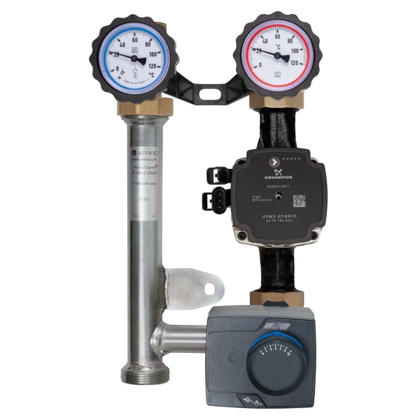 Products Our motto "Technology for Environmental Protection" has long been an inherent part of our product development philosophy and product range. We strive to improve the environment, to make processes which work with greater environmental compatibility and to avoid putting a strain on the environment. We offer you a multitude of innovative solutions, new products and smart concepts. More Informations Industries & Topics Industries & Topics Overview Fuel oil components Fuel oil components Overview Fast and clean oil filter change Avoiding fungal attacks in biofuel More performance with the sintered plastic sieve AFRISO Smart Home AFRISO Smart Home Overview Gateway HG 02 Products Products Overview AFRISOhome App Alexa Smart home applications Smart home applications Overview Leakage security Security Stand-alone applications Stand-alone applications Overview Getting started with AFRIShome Smart Home Craft 4.0 Craft 4.0 Overview OEM-Manifold systems Hydraulic Balancing Hydraulic Balancing Overview VarioQ Vario-DP Tank conversion Hygienic processes AFRISO Smart Home AFRISO Smart Home offers innovative solutions for intelligent home automation. With modern sensors and actuators, you can easily and conveniently control your home. More Informations Service-Center Service-Center Overview Service Contact persons Data exchange formats Catalogs Service-Center Flexible, cost-aware, on schedule, solution-oriented and fast – the AFRISO team always provides the decisive added value. More Informations Training & Events Training & Events Overview Exhibitions Exhibitions Overview SHK+E 2026, Essen IFH Intherm 2026, Nuremberg GET Nord 2026, Hamburg Schulungen & Trainings Schulungen & Trainings Overview Heizen mit flüssigen Brennstoffen Inhouse-Schulung - Heizen mit flüssigen Brennstoffen Inhouse-Schulung Heizölverbraucheranlagen Smart Home Experte Search ... PrimoTherm® K 180-2 DN25 KVS Vario 77815 PrimoTherm K 180-2 DN25 GP 3WM-SM Vario Images 1 Back PrimoTherm® K 180-2 DN25 KVS Vario | 77815 Heating pump assembly manufactured goods Documents Benefits pre-assembled, tightness-tested and heat-insulated assemblywith high-grade, robust mixerVersion with adjustable flow coefficient Kvs from 2.5 to 12 m3/h: Adjustment also possible during operation (under pressure) at any timeavailable with high energy efficiency pump class A Application Heating pump assembly for use in mixed heating circuits. With the 3-way mixer and the actuator, the flow temperature can be adjusted to a desired temperature by adding water from the return. The mixer version with adjustable flow coefficient Kvs offers maximum flexibility in adapting the system to individual control requirements. The flow coefficient Kvs can be modified at any later point in time, even if the system is under pressure. This way, a great variety of mixer/pump assemblies can be covered with a single version. Description Comact, pre-assembled and tightness-tested heating pump assembly with all required functional components, form-fit heat insulation (complies with German Energy Saving Regulation) and wall mounting unit. Adhesive labels with pictograms allow for easy designation.The flow line consists of:Combination valve with thermometer in the hand wheel (red mark, range 0/120 °C)3-way mixing valve with ProClick adapter system, either ARV 325 with flow coefficient Kvs 12 m3/h or KVS Vario with adjustable flow coefficient KvsMaintenance-free, silent actuator ARM 343 (6 Nm, 120 s, AC 230 V) with 0/90° angle of rotation, indication for direction of rotation, selector key "Manual/Automatic Mode" and ProClick adapter systemSystem connection G1½ male (boiler), G1 female (heating circuit) Suitable for pumps DN 25 with G1½ x 180 mm.The return line consists of:Combination valve with gravity brake, thermometer in the handle (blue mark, range 0/120 °C)Pipe for length compensation as T piece for mixer connection with screw connection for system connectionSystem connection G1½ male (boiler), G1 female (heating circuit) Technical data Downloads Technical data Axis distance 125 mmsystem connectionsBoiler: G1½ maleHeating circuit: G1 femaleOperating temperature rangeMedium: max. 95 °CMedium: short-term 120 °CSystem pressuremax. 10 barmax.Nominal sizeDN 25Flow coefficient Kvsadjustable: 2.5 – 4 – 5 – 6 – 8 – 12 m3/hLeak rateMixing valve ARV 325 KVS Vario: < 0.1 % of flow coefficient Kvs (up to ∆p 0.5 bar < 0.2 % of flow coefficient Kvs)Heat insulationPolypropylene EPPDimensionsW x H x D: 248 x 400 x 155 mmCirculation pumpGrundfos UPM3 HYBRID 25-70/180Length180 mmDegree of protectionIP 44 (EN 60529)Supply voltageAC 230 V, 50 HzEnergy efficiency classAPower inputGrundfos UPM3 HYBRID 25-70/180: 2 − 52 Wpumping headGrundfos UPM3 HYBRID 25-70/180: max. 7 mpumping volumeGrundfos UPM3 HYBRID 25-70/180: max. 3.6 m³/hoperating modes/settingsGrundfos UPM3 HYBRID 25-70/180: PWM-A (4),PWM-C (4),constant volume flow PP (3),konstanter Druck CP (3),constant speed of rotation CC (3) Downloads Heizungspumpengruppe PrimoTherm® K 180-1 DN 25, K 180-2 DN 25 Manuals PDF Download Related products