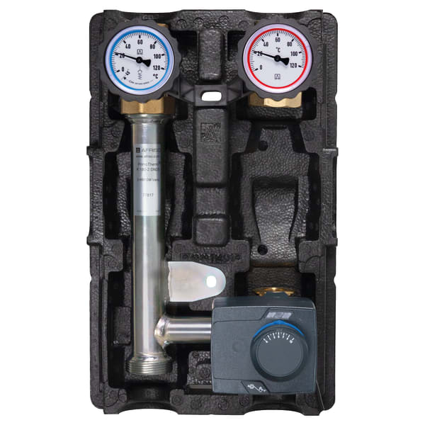 Images 3 Back PrimoTherm® K 180-2 DN25 KVS Vario | 77817 Heating pump assembly in-stock items Documents Benefits pre-assembled, tightness-tested and heat-insulated assemblywith high-grade, robust mixerVersion with adjustable flow coefficient Kvs from 2.5 to 12 m3/h: Adjustment also possible during operation (under pressure) at any timeavailable with high energy efficiency pump class A Application Heating pump assembly for use in mixed heating circuits. With the 3-way mixer and the actuator, the flow temperature can be adjusted to a desired temperature by adding water from the return. The mixer version with adjustable flow coefficient Kvs offers maximum flexibility in adapting the system to individual control requirements. The flow coefficient Kvs can be modified at any later point in time, even if the system is under pressure. This way, a great variety of mixer/pump assemblies can be covered with a single version. Description Comact, pre-assembled and tightness-tested heating pump assembly with all required functional components, form-fit heat insulation (complies with German Energy Saving Regulation) and wall mounting unit. Adhesive labels with pictograms allow for easy designation.The flow line consists of:Combination valve with thermometer in the hand wheel (red mark, range 0/120 °C)3-way mixing valve with ProClick adapter system, either ARV 325 with flow coefficient Kvs 12 m3/h or KVS Vario with adjustable flow coefficient KvsMaintenance-free, silent actuator ARM 343 (6 Nm, 120 s, AC 230 V) with 0/90° angle of rotation, indication for direction of rotation, selector key "Manual/Automatic Mode" and ProClick adapter systemSystem connection G1½ male (boiler), G1 female (heating circuit) Suitable for pumps DN 25 with G1½ x 180 mm.The return line consists of:Combination valve with gravity brake, thermometer in the handle (blue mark, range 0/120 °C)Pipe for length compensation as T piece for mixer connection with screw connection for system connectionSystem connection G1½ male (boiler), G1 female (heating circuit) Technical data Downloads Technical data Axis distance 125 mmsystem connectionsBoiler: G1½ maleHeating circuit: G1 femaleOperating temperature rangeMedium: max. 95 °CMedium: short-term 120 °CSystem pressuremax. 10 barmax.Nominal sizeDN 25Flow coefficient Kvsadjustable: 2.5 – 4 – 5 – 6 – 8 – 12 m3/hLeak rateMixing valve ARV 325 KVS Vario: < 0.1 % of flow coefficient Kvs (up to ∆p 0.5 bar < 0.2 % of flow coefficient Kvs)Heat insulationPolypropylene EPPDimensionsW x H x D: 248 x 400 x 155 mmCirculation pumpWithout circulation pumpPower inputWithout circulation pump: Without circulation pump: Without circulation pump: operating modes/settingsWithout circulation pump: Downloads Heizungspumpengruppe PrimoTherm® K 180-1 DN 25, K 180-2 DN 25 Manuals PDF Download