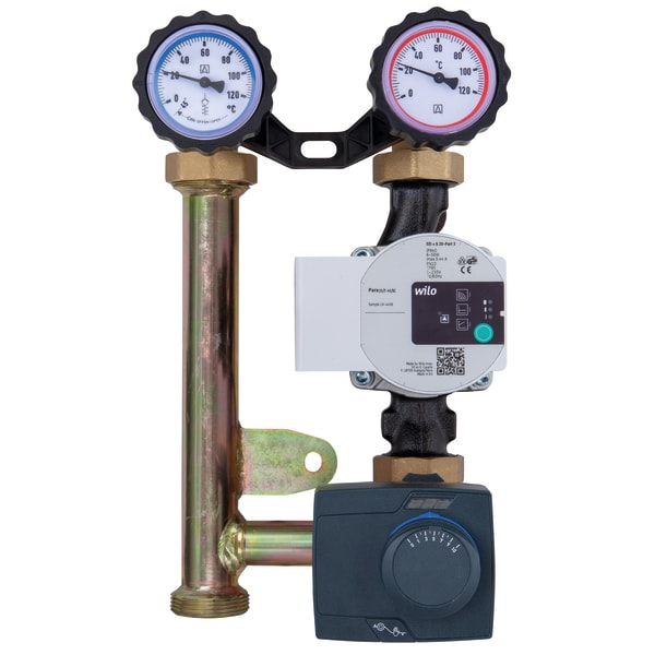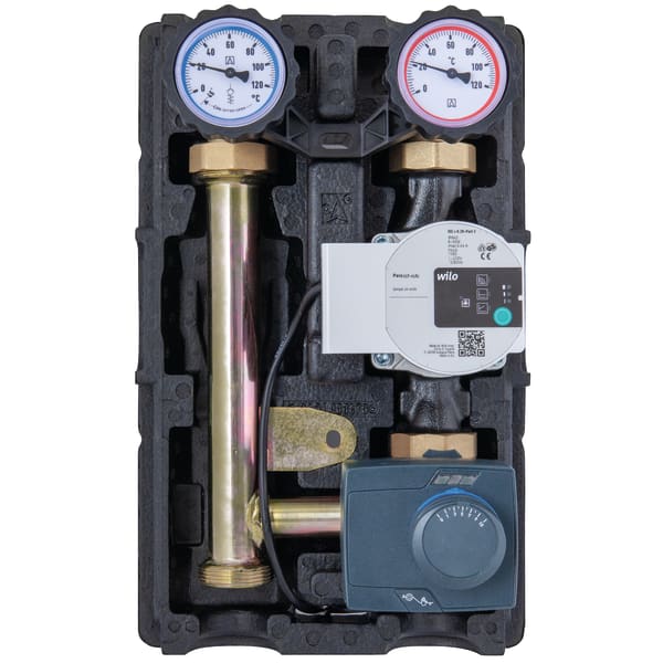 Images 3 Back PrimoTherm® K 180-2 DN25 | 77814 Heating pump assembly manufactured goods Documents Benefits pre-assembled, tightness-tested and heat-insulated assemblywith high-grade, robust mixerVersion with adjustable flow coefficient Kvs from 2.5 to 12 m3/h: Adjustment also possible during operation (under pressure) at any timeavailable with high energy efficiency pump class A Application Heating pump assembly for use in mixed heating circuits. With the 3-way mixer and the actuator, the flow temperature can be adjusted to a desired temperature by adding water from the return. The mixer version with adjustable flow coefficient Kvs offers maximum flexibility in adapting the system to individual control requirements. The flow coefficient Kvs can be modified at any later point in time, even if the system is under pressure. This way, a great variety of mixer/pump assemblies can be covered with a single version. Description Comact, pre-assembled and tightness-tested heating pump assembly with all required functional components, form-fit heat insulation (complies with German Energy Saving Regulation) and wall mounting unit. Adhesive labels with pictograms allow for easy designation.The flow line consists of:Combination valve with thermometer in the hand wheel (red mark, range 0/120 °C)3-way mixing valve with ProClick adapter system, either ARV 325 with flow coefficient Kvs 12 m3/h or KVS Vario with adjustable flow coefficient KvsMaintenance-free, silent actuator ARM 343 (6 Nm, 120 s, AC 230 V) with 0/90° angle of rotation, indication for direction of rotation, selector key "Manual/Automatic Mode" and ProClick adapter systemSystem connection G1½ male (boiler), G1 female (heating circuit) Suitable for pumps DN 25 with G1½ x 180 mm.The return line consists of:Combination valve with gravity brake, thermometer in the handle (blue mark, range 0/120 °C)Pipe for length compensation as T piece for mixer connection with screw connection for system connectionSystem connection G1½ male (boiler), G1 female (heating circuit) Technical data Downloads Technical data Axis distance 125 mmsystem connectionsBoiler: G1½ maleHeating circuit: G1 femaleOperating temperature rangeMedium: max. 95 °CMedium: short-term 120 °CSystem pressuremax. 10 barmax.Nominal sizeDN 25Flow coefficient Kvs12 m³/hHeat insulationPolypropylene EPPDimensionsW x H x D: 248 x 400 x 155 mmCirculation pumpWilo Para RS 25–180/6Length180 mmDegree of protectionIP 44 (EN 60529)Supply voltageAC 230 V, 50 HzEnergy efficiency classAPower inputWilo Para RS 25–180/6: 3 − 43 Wpumping headWilo Para RS 25–180/6: max. 6.7 mpumping volumeWilo Para RS 25–180/6: max. 3.2 m³/hoperating modes/settingsWilo Para RS 25–180/6: constant volume flow PP (3),konstanter Druck CP (3),constant speed of rotation CC (3) Downloads Heizungspumpengruppe PrimoTherm® K 180-1 DN 25, K 180-2 DN 25 Manuals PDF Download