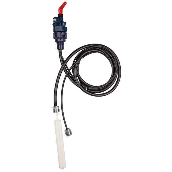 Images 3 Back Euroflex 3 mit Schwimmer | 20130 tank withdrawal system in-stock items Documents Benefits combination fitting made of high-strength plasticintegrated, TÜV-tested isolating piecegreen fuels ready: suitable for use at tank facilities filed with the new paraffinic fuels HVO or GTLEuroflex 3 for floating withdrawal, can also be converted for self-securing suction linematerials resistant to biofuel and biodiesel mixtures with max. 30 % FAMEPROOFED BARRIER if installed with vent hosewatertight up to 10 m water column - ideal for use in flood hazard areas Application For withdrawal of fuel oil from underground and aboveground tanks in single-line or dual-line mode. Suitable for fuel oil EL (DIN 51603-1), diesel fuel (EN 590), liquid fuels as per DIN SPEC 51603-6 and DIN/TS 51603-8 as well as biofuel and biodiesel with a maximum of 30 % FAME (EN 14214). Also suitable for use with the new paraffinic fuels HVO or GTL as an admixture or 100%. Suitable for flood hazard areas and flood risk areas.No floating withdrawal in the case of underground tanks. Description Combination fitting made of plastic as a withdrawal system with measuring line (not Euroflex 2) and TÜV-tested isolating piece that screws into the tank. G⅜ stainless steel threaded female connections for suction line and return. Universal compression fittings for pipes with 8 and 10 mm outside diameters for connecting the suction line are enclosed. Quick-action shut-off valve with lever for remote closing in emergency situations. Pressure- and vacuum-tight up to 1 bar.Euroflex 3 with float and special G1 screw connection for withdrawing oil in the clean area (as per TRWS 791 not recommended in underground tanks). Measuring line connection for hose or pipe with 6 mm outside diameter. Suction hose length 2.15 m or 3.15 m with additional float at the suction hose end.GWG 12 K/1C, combination of level sensor and withdrawal system. With measuring line connection for hose or pipe with 6 mm outside diameter. For battery tanks as per DIN 6620 and tanks as per DIN 6625 manufactured on site. Specially useful if there is no connection socket at the tank. Connection G1½. Technical data Downloads Technical data ConnectionTank: G1 malesuction line/return line: G⅜ femaleMeasuring line: 6 mmLengthSuction hose: 2.15 mmeasuring hoseEuroflex 3 (2.15): 2.15 mTest pressuremax. 6 barFlow ratemax. 150 l/hMaterialScrew fitting: Kunststoff (POM), blauSuction hose: NBR/PVCBottom part: Zamak (ZnAl4Cu1)approvalConformity certificate (EN 12514-2), ÜHP Downloads Tankentnahmeeinrichtung Euroflex, Miniflex Manuals PDF Download