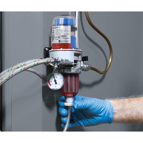 Images 5 Back FloCo-Top-2KM | 70110 automatic fuel oil de-aerator in-stock items Documents Benefits multiple filtration for maximum separation of dirt particlesBackflow preventer with integrated pressure relief towards the tankDrain valve for fast and clean filter changeBypass valve for easy and clean burner hose replacementDual float safety system keeps oil foam from escapingVacuum gauge indicates when it is time to replace the filterreduced height facilitates installation if mounting space is limitedeasy installation with click system and AFRISO universal screw connection or standard screw connectionPROOFED BARRIER if installed with vent hosematerials resistant to biofuel and biodiesel mixtures with max. 30 % FAMEgreen fuels ready: suitable for use at tank facilities filed with the new paraffinic fuels HVO or GTLwatertight up to 10 m water column - ideal for use in flood hazard areas Application For single-line systems with return line in oil-fired systems for continuous de-aeration. Suitable for fuel oil EL (DIN 51603-1), diesel fuel (EN 590), liquid fuels as per DIN SPEC 51603-6 and DIN/TS 51603-8 as well as biofuel and biodiesel with a maximum of 30 % FAME (EN 14214). This product is therefore ideal for all ecologically upgraded fuel oil consuming systems that use the new paraffinic fuels HVO or GTL as an admixture or 100 %. Also for use in flood hazard areas and flood risk areas.FloCo-TOP-2 can be installed in any system. Multiple filtration is recommended for burners with an oil consumption of < 20 l/h while larger systems should be operated with single filtration. Description Automatic fuel oil de-aerator, safety version, with integrated filter, shut-off valve and vacuum gauge. Housing with changeover valve for multiple filtration as well as backflow preventer with integrated pressure relief towards the tank. Compact de-aerator hood made of transparent plastic with dual float safety system to keep oil foam from escaping via the de-aerator opening. The vent hose is connected at the side in an unobtrusive way. For venting, the oil is guided via the float chamber and can then be added directly to the flow or it can be filtered again by switching a valve. In the case of multiple filtration, the return oil increases the flow rate so that the filter bowl is permanently filled with de-aerated oil. In service mode, the vacuum gauge indicates the pump vacuum. The shut-off valve can be closed to check the suction capacity of the burner pump. Increased vacuum provides information on the degree of pollution of the filter. The drain valve ensures that replacing the filter is easy and clean: Connect the hose, open the drain valve, loosen the union nut of the filter cup and drain the oil in a controlled way. When the burner hose needs to be replaced, it is sufficient to open a bypass valve so that the oil is drained from the float chamber via the filter cup and the drain system. Watertight up to 10 m water column. Technical data Downloads Spare parts Technical data connection burner endG⅜ male with 60° cone for burner hosesConnection tankG⅜ femaleNozzle capacitymax. 100 l/hReturn flowmax. 120 l/hSeparating capacity air/gas> 4 l/hMounting positionFloat housing vertical to the topOperating temperature rangeMedium: max. 60 °CAmbient: max. 60 °COperating overpressuremax. 0.7 bar(corresponds to static oil column of approx. 8 m)Test pressure 6 barVacuum gaugeRange: -0.7/0.9 barDimensions (W x H x D)short cup: 183 x 254 x 103 mmMaterialHousing: Zinc die castDe-aerator hood: transparent plasticFilter cup: transparent plasticTestTÜV-tested (S 556 2021 S1)approvalConformity certificate (ÜHP) as per EN 12514Scope of deliveryFuel oil de-aeratorsUniversalverschraubungen für Rohre ⌀ 6/8/10 mmBracket with mounting materialSchmutzabdeckung zum Anschluss des Entlüftungsschlauchsdrain hose Downloads Heizölentlüfter FloCo-Top-2 Manuals PDF Download PRO_TEC_STP_70110-19_FLOCO-TOP-2.STP STEP 3D Modell Domestic Technology STP Download Spare parts Accessories and spare parts Equipment for storage and distribution of liquid fuels Abb. Bezeichnung Halter für Heizölentlüfter | 70127 Manometer für Ölarmatur | 70030