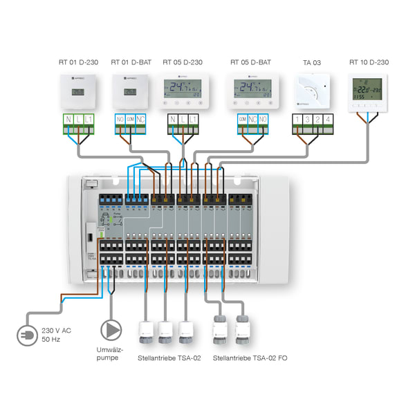 Products Our motto "Technology for Environmental Protection" has long been an inherent part of our product development philosophy and product range. We strive to improve the environment, to make processes which work with greater environmental compatibility and to avoid putting a strain on the environment. We offer you a multitude of innovative solutions, new products and smart concepts. More Informations Industries & Topics Industries & Topics Overview Fuel oil components Fuel oil components Overview Fast and clean oil filter change Avoiding fungal attacks in biofuel More performance with the sintered plastic sieve AFRISO Smart Home AFRISO Smart Home Overview Gateway HG 02 Products Products Overview AFRISOhome App Alexa Smart home applications Smart home applications Overview Leakage security Security Stand-alone applications Stand-alone applications Overview Getting started with AFRIShome Smart Home Craft 4.0 Craft 4.0 Overview OEM-Manifold systems Hydraulic Balancing Hydraulic Balancing Overview VarioQ Vario-DP Tank conversion Hygienic processes AFRISO Smart Home AFRISO Smart Home offers innovative solutions for intelligent home automation. With modern sensors and actuators, you can easily and conveniently control your home. More Informations Service-Center Service-Center Overview Service Contact persons Data exchange formats Catalogs Service-Center Flexible, cost-aware, on schedule, solution-oriented and fast – the AFRISO team always provides the decisive added value. More Informations Training & Events Training & Events Overview Exhibitions Exhibitions Overview SHK+E 2026, Essen IFH Intherm 2026, Nuremberg GET Nord 2026, Hamburg Schulungen & Trainings Schulungen & Trainings Overview Heizen mit flüssigen Brennstoffen Inhouse-Schulung - Heizen mit flüssigen Brennstoffen Inhouse-Schulung Heizölverbraucheranlagen Smart Home Experte Search Domestic technology Equipment for surface heating and cooling systems 80236 CosiTherm Basic Klemmleiste WB 10 D8-230 Connection controller terminal bar WB 10 D-8-230 Images 2 Back Basic Regelklemmleiste WB 10 D-8-230 | 80236 Einzelraum-Temperaturregelung CosiTherm® - Draht in-stock items Documents Benefits Controller terminal bar for connection of actuators and room thermostatsfor water-based underfloor heating systemssuitable for room thermostat RT 10 D-230 Application For wiring of the room thermostats and actuators. The controller terminal bar supplies the actuators and room thermostats. Description Up to 8 room thermostats and up to 20 actuators can be connected to the controller terminal bar. The room thermostat measures the actual temperature in the corresponding rooms. The reference temperature is adjusted by means of the keys of the room thermostat. The room thermostat then switches the thermostatic actuator via the controller terminal bar to control the heating circuit at the manifold.Room thermostats D-BAT require a cable 2 x 0.5 mm², room thermostats D-230 a cable 3 x 0.5 mm².It is also possible to connect a pump. When all actuators are de-energised (closed), the pump is switched off. Technical data Downloads Technical data Connectionsmax. 8 control circuits and 20 actuatorsmax. 1 Raumthermostat pro RegelkreisControl circuits 1 + 2 = 4 actuators eachRegelkreis 3 – 8 = je 2 StellantriebeOperating temperature rangeAmbient: 5/50 °CStorage: 5/50 °CSupply voltageAC 230 VHousingplastic housing (PC/ABS)Colour: light grey, similar to RAL 7047W x H x D: 210 x 92 x 24 mmDegree of protection: IP 20 (EN 60529)Weight 275 g ( )Scope of deliveryController terminal bar with connection cable/Euro plugBetriebsanleitung Downloads Basic Klemmleiste WB 10 D8-230 Manuals PDF Download Related products