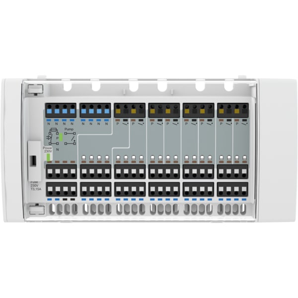 Connection controller terminal bar WB 10 D-8-230 Images 2 Back Basic Regelklemmleiste WB 10 D-8-230 | 80236 Einzelraum-Temperaturregelung CosiTherm® - Draht in-stock items Documents Benefits Controller terminal bar for connection of actuators and room thermostatsfor water-based underfloor heating systemssuitable for room thermostat RT 10 D-230 Application For wiring of the room thermostats and actuators. The controller terminal bar supplies the actuators and room thermostats. Description Up to 8 room thermostats and up to 20 actuators can be connected to the controller terminal bar. The room thermostat measures the actual temperature in the corresponding rooms. The reference temperature is adjusted by means of the keys of the room thermostat. The room thermostat then switches the thermostatic actuator via the controller terminal bar to control the heating circuit at the manifold.Room thermostats D-BAT require a cable 2 x 0.5 mm², room thermostats D-230 a cable 3 x 0.5 mm².It is also possible to connect a pump. When all actuators are de-energised (closed), the pump is switched off. Technical data Downloads Technical data Connectionsmax. 8 control circuits and 20 actuatorsmax. 1 Raumthermostat pro RegelkreisControl circuits 1 + 2 = 4 actuators eachRegelkreis 3 – 8 = je 2 StellantriebeOperating temperature rangeAmbient: 5/50 °CStorage: 5/50 °CSupply voltageAC 230 VHousingplastic housing (PC/ABS)Colour: light grey, similar to RAL 7047W x H x D: 210 x 92 x 24 mmDegree of protection: IP 20 (EN 60529)Weight 275 g ( )Scope of deliveryController terminal bar with connection cable/Euro plugBetriebsanleitung Downloads Basic Klemmleiste WB 10 D8-230 Manuals PDF Download