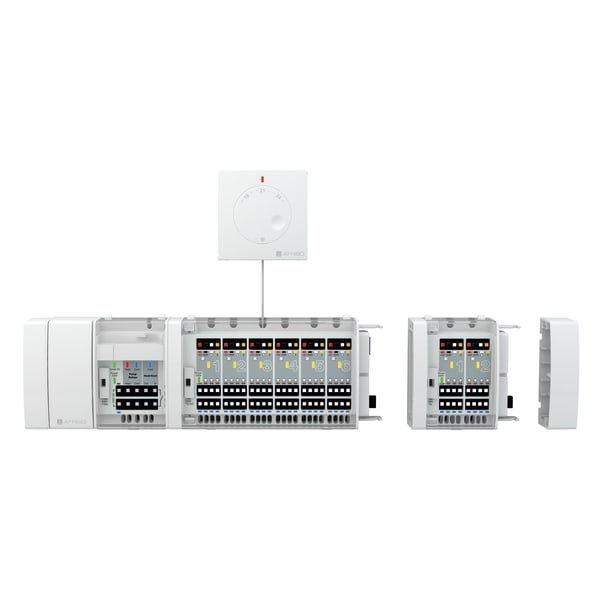 Images 1 Reglermodule Draht Einzelraum-Temperaturregelung CosiTherm® - Draht Variants Documents Benefits Temperature controller for the connection of thermal actuatorsfor manifold systems for heating and coolingextremely flat room temperature sensor with a height of 12.5 mmRoom temperature sensor with wire connectionTimer module for programming temperature reduction, pump operating time and valve protection function Application Controls the temperature of individual rooms in connection with manifold systems for heating and cooling. Description The base version of the single room temperature controller CosiTherm® wired consists of a base module, at least one controller module with two or six independent control circuits and a corresponding number of room temperature sensors. The controller modules can be interconnected in a modular way to account for the number of control circuits/rooms. One room temperature sensor is required per control circuit; it is wired to the controller module. The room temperature sensor measures the actual temperature in the room. The reference temperature is adjusted via the rotary knob of the room temperature sensor. The controller module compares the actual temperature and the reference temperature and controls the volume flow of the heating/cooling water via the thermostatic actuators of the manifold system.An optional timer module with display and an integrated hundred-year calendar can be plugged into the base module. It features two independently programmable switching channels for temperature reduction, nine programmable memory blocks and a valve and pump protection function. The additional pump running time is adjustable. The terminals of the controller modules are colour-coded for easy assignment to the wires; in conjunction with the DIN rail snap connectors at the rear of the housing, this facilitates installation. Variants Technical data Downloads Variants Part no.Controller module D278114Controller module D678115 in-stock items manufactured goods Technical data ConnectionsController module D2: max. 2 room temperature sensors and 8 actuatorsBase module BMController modulefunctionsComparison of actual and reference temperatures,Regelung Heiz-/Kühlwasser über angeschlossene thermische Stellantriebe,switchover of the system to "Heating" or "Cooling",Steuerung der Heiz-/KühlpumpenSupply voltageAC 230 V, DC 5 V (via base module BM)Nominal powerController module D2: 0.1 WHousingplastic housing (PC/ABS)W x H x DController module D2: 73 x 92 x 45 mmDegree of protection: IP 20 (EN 60529)WeightController module D2: 130 gTimer module UMWireless module for timer module FMA Downloads CosiTherm® PDF Download Temperaturregelung CosiTherm® Domestic Technology PDF English German Temperaturregelung CosiTherm® Domestic Technology PDF English German Reglermodul (Draht) D2, D6 Manuals PDF Download