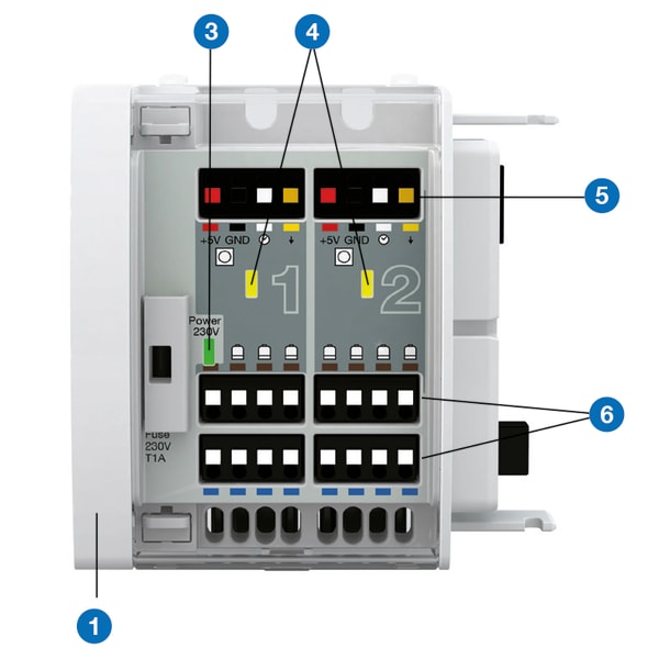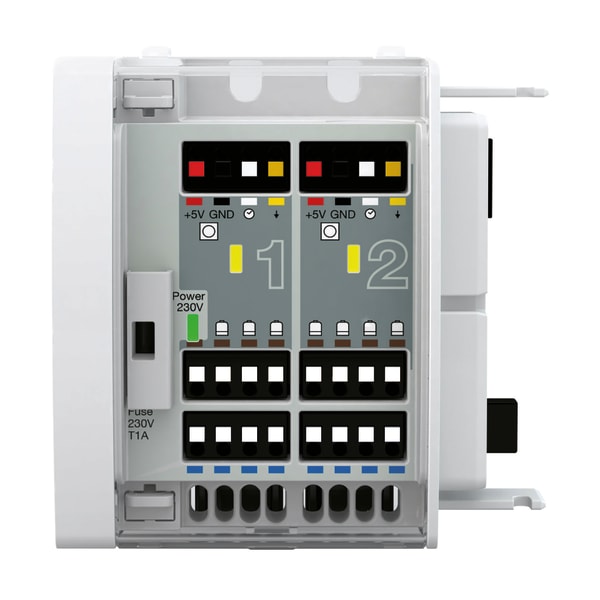 Controller module with two control circuits LED green: Indication mains voltage for thermal actuators LED yellow: Indication thermal actuator active Terminal block for room temperature sensors Terminal block for thermal actuators Images 3 Back Reglermodule Draht | 78114 Einzelraum-Temperaturregelung CosiTherm® - Draht in-stock items Documents Benefits Temperature controller for the connection of thermal actuatorsfor manifold systems for heating and coolingextremely flat room temperature sensor with a height of 12.5 mmRoom temperature sensor with wire connectionTimer module for programming temperature reduction, pump operating time and valve protection function Application Controls the temperature of individual rooms in connection with manifold systems for heating and cooling. Description The base version of the single room temperature controller CosiTherm® wired consists of a base module, at least one controller module with two or six independent control circuits and a corresponding number of room temperature sensors. The controller modules can be interconnected in a modular way to account for the number of control circuits/rooms. One room temperature sensor is required per control circuit; it is wired to the controller module. The room temperature sensor measures the actual temperature in the room. The reference temperature is adjusted via the rotary knob of the room temperature sensor. The controller module compares the actual temperature and the reference temperature and controls the volume flow of the heating/cooling water via the thermostatic actuators of the manifold system.An optional timer module with display and an integrated hundred-year calendar can be plugged into the base module. It features two independently programmable switching channels for temperature reduction, nine programmable memory blocks and a valve and pump protection function. The additional pump running time is adjustable. The terminals of the controller modules are colour-coded for easy assignment to the wires; in conjunction with the DIN rail snap connectors at the rear of the housing, this facilitates installation. Technical data Downloads Technical data ConnectionsController module D2: max. 2 room temperature sensors and 8 actuatorsBase module BMController modulefunctionsComparison of actual and reference temperatures,Regelung Heiz-/Kühlwasser über angeschlossene thermische Stellantriebe,switchover of the system to "Heating" or "Cooling",Steuerung der Heiz-/KühlpumpenSupply voltageAC 230 V, DC 5 V (via base module BM)Nominal powerController module D2: 0.1 WHousingplastic housing (PC/ABS)W x H x DController module D2: 73 x 92 x 45 mmDegree of protection: IP 20 (EN 60529)WeightController module D2: 130 gTimer module UMWireless module for timer module FMA Downloads Reglermodul (Draht) D2, D6 Manuals PDF Download