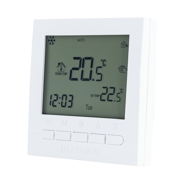 Products Our motto "Technology for Environmental Protection" has long been an inherent part of our product development philosophy and product range. We strive to improve the environment, to make processes which work with greater environmental compatibility and to avoid putting a strain on the environment. We offer you a multitude of innovative solutions, new products and smart concepts. More Informations Industries & Topics Industries & Topics Overview Fuel oil components Fuel oil components Overview Fast and clean oil filter change Avoiding fungal attacks in biofuel More performance with the sintered plastic sieve AFRISO Smart Home AFRISO Smart Home Overview Gateway HG 02 Products Products Overview AFRISOhome App Alexa Smart home applications Smart home applications Overview Leakage security Security Stand-alone applications Stand-alone applications Overview Getting started with AFRIShome Smart Home Craft 4.0 Craft 4.0 Overview OEM-Manifold systems Hydraulic Balancing Hydraulic Balancing Overview Vario-DP Tank conversion Hygienic processes AFRISO Smart Home AFRISO Smart Home offers innovative solutions for intelligent home automation. With modern sensors and actuators, you can easily and conveniently control your home. More Informations Service-Center Service-Center Overview Service Contact persons Catalogs Service-Center Flexible, cost-aware, on schedule, solution-oriented and fast – the AFRISO team always provides the decisive added value. More Informations Training & Events Training & Events Overview Exhibitions Exhibitions Overview SHK+E 2026, Essen IFH Intherm 2026, Nuremberg GET Nord 2026, Hamburg Search ... RT 10 D-230 C Raumthermostat RT10 D-230 C Anschlussschema Images 4 Back Room thermostat RT 10 D-230 C | 86063 Room thermostats RT 10 D-230 C in-stock items Benefits easy mounting on standard in-wall switch boxes230 V versionübersichtliches Display mit Heizen, Kühlen und AnforderungsanzeigeTimer programs can be storedsuitable for heating and cooling Technical data Accessories Technical data Programsjeweils für Heizen und KühlenAdjustable for 5 + 2 or 6 + 1 or 7 daysOperating temperature rangeAmbient: 5/60 °CStorage: 5/60 °CTemperature adjustment range5/35 °CAccuracy: ± 0.5 KSupply voltageAC 230 VContact ratingmax. AC 250 V, 3 AHousingPlastic (PC)Colour: white (RAL 9003)W x H x D: 86 x 86 x 40 mmDegree of protection: IP 20 (EN 60529)Weight 165 g Scope of deliveryRaumthermostat RT 10 D-230 C Accessories Accessories and spare parts for equipment for surface heating and cooling Abb. Bezeichnung NTC Fühler RT 10 D Cable length 3 m | 86069 Related products
