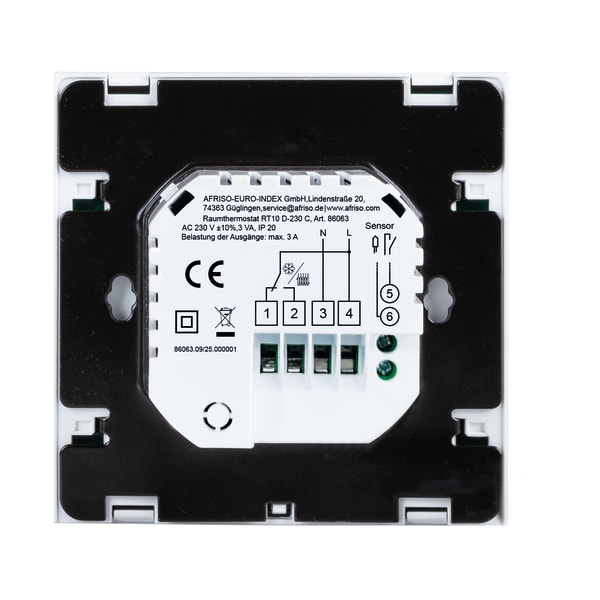 Anschlussschema Images 5 Back Room thermostat RT 10 D-230 C | 86063 Room thermostats RT 10 D-230 C in-stock items Documents Benefits easy mounting on standard in-wall switch boxes230 V versionclear display with heating, cooling and request indicatorTimer programs can be storedsuitable for heating and cooling Application Determination of the actual ambient temperature and adjustment of the reference value for the room temperature for use in water-based underfloor heating systems, in heating and cooling applications. Description The room thermostat RT 10 D-230 C is used in water-based underfloor heating systems in conjunction with thermostatic actuators and/or controller terminal bars (e.g. CosiTherm® Basic WB 10 D-8-230 and WB 01 D). Each room thermostat measures the actual ambient temperature and switches the output to obtain the required reference temperature. The reference value for the room temperature is adjusted by means of the keys. The actual temperature in rooms with an underfloor heating system is compared to the reference temperature on an ongoing basis. In addition to the reference temperature, you can store timer programs (e.g. Day/Night/Heating/Cooling). The display shows values such as temperature, time, heating and cooling mode. Switching between heating and cooling is done either directly on the device or centrally via a potential-free collective contact.An additional NTC temperature probe can be connected to the RT room thermostat (not included in scope of delivery) which can be used as a floor temperature sensor or as an alternative room temperature sensor, depending on the configuration. Frost protection functions and screed temperature protection functions can also be configured. Technical data Downloads Accessories Technical data Programsjeweils für Heizen und KühlenAdjustable for 5 + 2 or 6 + 1 or 7 daysOperating temperature rangeAmbient: 5/60 °CStorage: 5/60 °CTemperature adjustment range5/35 °CAccuracy: ± 0.5 KSupply voltageAC 230 VContact ratingmax. AC 250 V, 3 AHousingPlastic (PC)Colour: white (RAL 9003)W x H x D: 86 x 86 x 40 mmDegree of protection: IP 20 (EN 60529)Weight 165 g Scope of deliveryRaumthermostat RT 10 D-230 C Downloads AFRISO_RAUMTHERMOSTAT-RT-10-D-230-C-RAUMTHERMOSTAT_86063_DEU_DEU.PDF Data sheets Domestic Technology PDF English German AFRISO_RAUMTHERMOSTAT_DEU_DEU_20260210_004827695.PDF Data sheets Domestic Technology PDF English German Accessories Accessories and spare parts for equipment for surface heating and cooling Abb. Bezeichnung NTC Fühler RT 10 D Cable length 3 m | 86069