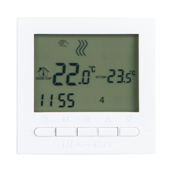 Products Our motto "Technology for Environmental Protection" has long been an inherent part of our product development philosophy and product range. We strive to improve the environment, to make processes which work with greater environmental compatibility and to avoid putting a strain on the environment. We offer you a multitude of innovative solutions, new products and smart concepts. More Informations Industries & Topics Industries & Topics Overview Fuel oil components Fuel oil components Overview Fast and clean oil filter change Avoiding fungal attacks in biofuel More performance with the sintered plastic sieve AFRISO Smart Home AFRISO Smart Home Overview Gateway HG 02 Products Products Overview AFRISOhome App Alexa Smart home applications Smart home applications Overview Leakage security Security Stand-alone applications Stand-alone applications Overview Getting started with AFRIShome Smart Home Craft 4.0 Craft 4.0 Overview OEM-Manifold systems Hydraulic Balancing Hydraulic Balancing Overview VarioQ Vario-DP Tank conversion Hygienic processes AFRISO Smart Home AFRISO Smart Home offers innovative solutions for intelligent home automation. With modern sensors and actuators, you can easily and conveniently control your home. More Informations Service-Center Service-Center Overview Service Contact persons Data exchange formats Catalogs Service-Center Flexible, cost-aware, on schedule, solution-oriented and fast – the AFRISO team always provides the decisive added value. More Informations Training & Events Training & Events Overview Exhibitions Exhibitions Overview SHK+E 2026, Essen IFH Intherm 2026, Nuremberg GET Nord 2026, Hamburg Schulungen & Trainings Schulungen & Trainings Overview Heizen mit flüssigen Brennstoffen Inhouse-Schulung - Heizen mit flüssigen Brennstoffen Inhouse-Schulung Heizölverbraucheranlagen Smart Home Experte Search Domestic technology Equipment for surface heating and cooling systems 86062 Raumthermostat RT10 D-230 Images 4 Back RT 10 D-230 | 86062 Room thermostat in-stock items Documents Benefits easy mounting on standard in-wall switch boxes230 V versionlarge display with additional informationTimer programs can be stored Application Determination of the actual ambient temperature and adjustment of the reference value for the room temperature for use in water-based underfloor heating systems. Description The room thermostat RT 10 D-230 is used in water-based underfloor heating systems in conjunction with thermostatic actuators and/or controller terminal bars (e.g. CosiTherm® Basic WB 10 D-8-230 and WB 01 D). Each room thermostat measures the actual ambient temperature and switches the output to obtain the required reference temperature. The reference value for the room temperature is adjusted by means of the keys. The actual temperature in rooms with an underfloor heating system is compared to the reference temperature on an ongoing basis. In addition to the reference temperature, you can store timer programs (e.g. Day/Night). The display shows values such as temperature, time or heating mode. Technical data Downloads Technical data ProgramsAdjustable for 5 + 2 or 6 + 1 or 7 daysOperating temperature rangeAmbient: 5/60 °CStorage: 5/60 °CTemperature adjustment range5/35 °CAccuracy: ± 0.5 KSupply voltageAC 230 VContact ratingmax. AC 250 V, 3 AHousingPlastic (PC)Colour: white (RAL 9003)Degree of protection: IP 20 (EN 60529)Weight 165 g Scope of deliveryRoom thermostat RT 10 D-230Betriebsanleitung Downloads Raumthermostat RT 10 D-230 Manuals PDF Download Related products