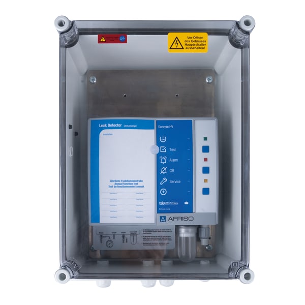 Images 4 Back Eurovac HV im Schutzgehäuse | 43774 Vacuum type leak detector manufactured goods Documents Benefits with visual and audible alarms, Acknowledge button and switching outputhigh energy efficiency: economical, powerful DC motor with high starting torqueservice indicator for annual maintenancewith power outage monitoring (with optional 9 V battery)Leak detector class I, EN 13160-1/-2large supply voltage range (AC 100–240 V) for worldwide applicationRelay output for additional signalling devices, additional alarm units, event reporting systems or for integration into building control systemsVersion in protective housing (IP 65), available with heating and/or horn Application Class I vacuum type leak detector according to EN 13160-1/-2 for safe monitoring of double-walled tanks and single-walled tanks with inner lining for the unpressurised storage of water-polluting liquids with a flash point > 55 °C, also AdBlue® (urea solution 32.5 %) according to DIN 70070 or other media (e.g. used oil, hydraulic oil, cooling agent from grinding processes, brake fluid, etc.). The broad voltage range (AC 100–240 V) allows for application in a large variety of countries. Description Compact leak detector in a robust wall mounting housing with audible and visual alarms. The audible alarm can be muted with the Acknowledge button. Eurovac HV maintains a vacuum in the interstitial space of the tank (high vacuum range). The vacuum pump is operated by an economical DC motor with a high starting torque (energy efficiency class AA++). Eurovac features a switching output for additional equipment (such as additional alarm unit ZAG 01) or integration into building control systems. The pump operating time can be displayed. Three hose connections (red, white, green) for the pneumatic connection to the interstitial space of the tank. The universal connection pieces can be used for 4 mm and 6 mm hoses. With condensate trap to protect the electronics. Electrical connection from the top or from the bottom. An optional 9 V battery can be connected so that an alarm is triggered in the case of power outage. For outdoor applications, Eurovac HV is available in a protective housing (IP 65). Alarm units with the EnOcean-ready label can be integrated into your existing building automation systems at a later point in time. To do so, plug the EnOcean® wireless module TCM 320 into the EnOcean® interface (PCB of the device). The AFRISO gateway in conjunction with additional AFRISO products with EnOcean® wireless technology allow you to configure a whole range of fully customisable, extensible features for the protection of buildings. Technical data Downloads Accessories Spare parts Technical data Operating temperature rangeAmbient: -5/+60 °Cin protective housing with heating: -25/+60 °CStorage: -25/+60 °CSupply voltageAC 100 − 240 VNominal power< 10 VASwitching outputRelay contact: 1 x voltage-free changeover contactContact rating: max. AC 250 V, 2 AOperating pressureInterstitial space: ca. -400 mbarHousingWall mounting housing made of impact-resistant plastic (ABS)W x H x D: 202 x 230 x 70 mmWeight: 1.1 kgDegree of protection: IP 30 (EN 60529)Alarm soundmin. 70 dB(A)approvalCE marking as per EC Construction Products Regulation 305/2011, EU 574/2014, EN 13160-1/-2 and ÜHP Downloads Vakuum-Leckanzeiger Eurovac NV Manuals PDF Download Accessories Mounting accessories for inner linings Abb. Bezeichnung Liquid barrier | 43646 condensate bar | 43692 Function extensions Abb. Bezeichnung TCM 320 | 78082 Spare parts Accessories and spare parts leak detectors, leak monitoring systems and leak protection linings Abb. Bezeichnung Foil keypad | 43728 Vakuumpumpe Eurovac | 43777