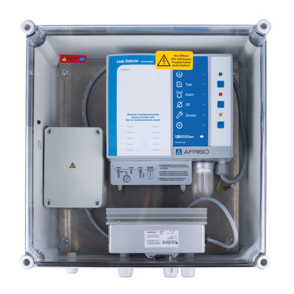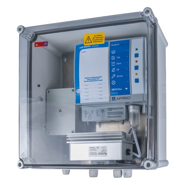 Images 4 Back Eurovac HV im Schutzgehäuse | 43793 Vacuum type leak detector manufactured goods Documents Benefits with visual and audible alarms, Acknowledge button and switching outputhigh energy efficiency: economical, powerful DC motor with high starting torqueservice indicator for annual maintenancewith power outage monitoring (with optional 9 V battery)Leak detector class I, EN 13160-1/-2large supply voltage range (AC 100–240 V) for worldwide applicationRelay output for additional signalling devices, additional alarm units, event reporting systems or for integration into building control systemsVersion in protective housing (IP 65), available with heating and/or horn Application Class I vacuum type leak detector according to EN 13160-1/-2 for safe monitoring of double-walled tanks and single-walled tanks with inner lining for the unpressurised storage of water-polluting liquids with a flash point > 55 °C, also AdBlue® (urea solution 32.5 %) according to DIN 70070 or other media (e.g. used oil, hydraulic oil, cooling agent from grinding processes, brake fluid, etc.). The broad voltage range (AC 100–240 V) allows for application in a large variety of countries. Description Compact leak detector in a robust wall mounting housing with audible and visual alarms. The audible alarm can be muted with the Acknowledge button. Eurovac HV maintains a vacuum in the interstitial space of the tank (high vacuum range). The vacuum pump is operated by an economical DC motor with a high starting torque (energy efficiency class AA++). Eurovac features a switching output for additional equipment (such as additional alarm unit ZAG 01) or integration into building control systems. The pump operating time can be displayed. Three hose connections (red, white, green) for the pneumatic connection to the interstitial space of the tank. The universal connection pieces can be used for 4 mm and 6 mm hoses. With condensate trap to protect the electronics. Electrical connection from the top or from the bottom. An optional 9 V battery can be connected so that an alarm is triggered in the case of power outage. For outdoor applications, Eurovac HV is available in a protective housing (IP 65). Alarm units with the EnOcean-ready label can be integrated into your existing building automation systems at a later point in time. To do so, plug the EnOcean® wireless module TCM 320 into the EnOcean® interface (PCB of the device). The AFRISO gateway in conjunction with additional AFRISO products with EnOcean® wireless technology allow you to configure a whole range of fully customisable, extensible features for the protection of buildings. Technical data Downloads Accessories Spare parts Technical data Operating temperature rangeAmbient: -5/+60 °Cin protective housing with heating: -25/+60 °CStorage: -25/+60 °CSupply voltageAC 100 − 240 VNominal power< 10 VASwitching outputRelay contact: 1 x voltage-free changeover contactContact rating: max. AC 250 V, 2 AOperating pressureInterstitial space: ca. -400 mbarHousingWall mounting housing made of impact-resistant plastic (ABS)W x H x D: 202 x 230 x 70 mmWeight: 1.1 kgDegree of protection: IP 30 (EN 60529)Alarm soundmin. 70 dB(A)approvalCE marking as per EC Construction Products Regulation 305/2011, EU 574/2014, EN 13160-1/-2 and ÜHP Downloads Vakuum-Leckanzeiger Eurovac NV Manuals PDF Download Accessories Mounting accessories for inner linings Abb. Bezeichnung Liquid barrier | 43646 condensate bar | 43692 Function extensions Abb. Bezeichnung TCM 320 | 78082 Spare parts Accessories and spare parts leak detectors, leak monitoring systems and leak protection linings Abb. Bezeichnung Foil keypad | 43728 Vakuumpumpe Eurovac | 43777