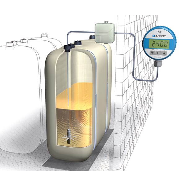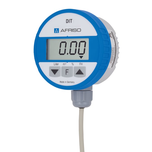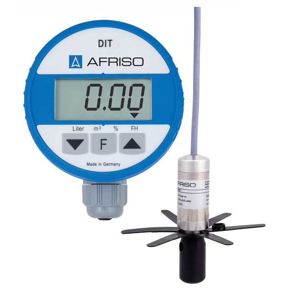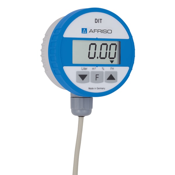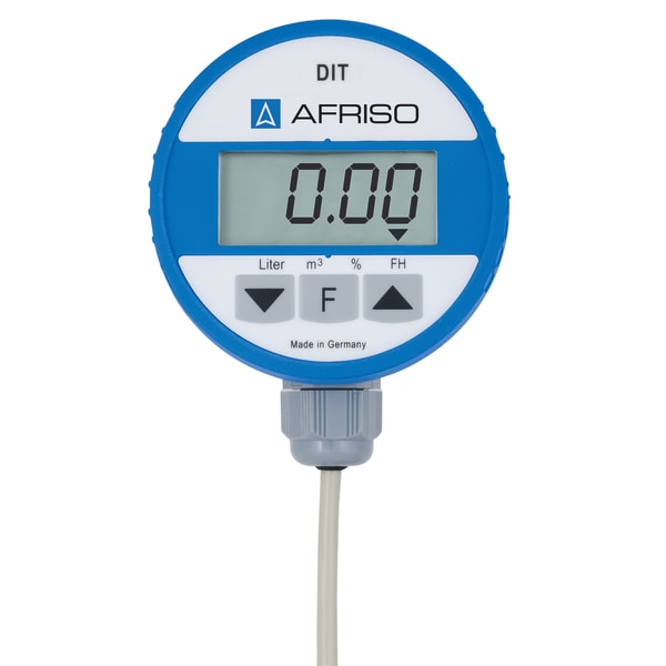 Products Our motto "Technology for Environmental Protection" has long been an inherent part of our product development philosophy and product range. We strive to improve the environment, to make processes which work with greater environmental compatibility and to avoid putting a strain on the environment. We offer you a multitude of innovative solutions, new products and smart concepts. More Informations Industries & Topics Industries & Topics Overview Fuel oil components Fuel oil components Overview Fast and clean oil filter change Avoiding fungal attacks in biofuel More performance with the sintered plastic sieve AFRISO Smart Home AFRISO Smart Home Overview Gateway HG 02 Products Products Overview AFRISOhome App Alexa Smart home applications Smart home applications Overview Leakage security Security Stand-alone applications Stand-alone applications Overview Getting started with AFRIShome Smart Home Craft 4.0 Craft 4.0 Overview OEM-Manifold systems Hydraulic Balancing Hydraulic Balancing Overview VarioQ Vario-DP Tank conversion Hygienic processes AFRISO Smart Home AFRISO Smart Home offers innovative solutions for intelligent home automation. With modern sensors and actuators, you can easily and conveniently control your home. More Informations Service-Center Service-Center Overview Service Contact persons Data exchange formats Catalogs Service-Center Flexible, cost-aware, on schedule, solution-oriented and fast – the AFRISO team always provides the decisive added value. More Informations Training & Events Training & Events Overview Exhibitions Exhibitions Overview SHK+E 2026, Essen IFH Intherm 2026, Nuremberg GET Nord 2026, Hamburg Search Domestic technology Level indicators and level controllers 52150 Digitaler Tankinhaltsanzeiger DIT 10 Images 5 Back DIT 10 | 52150 digital tank contents indicator in-stock items Documents Benefits for fuel oil EL, L, diesel fuel, biodiesel and wateruniversal application in tanks of up to 4 m in height or diameterno external supply voltage requiredpush-to-read function for extremely long battery service lifematerials resistant to biofuel and biodiesel with max. 100 % FAMEwatertight up to 10 m water column - ideal for use in flood hazard areas Application For level measurement in tanks containing fuel oil EL, L (DIN 51603-1), diesel fuel (EN 590), liquid fuels as per DIN SPEC 51603-6 and DIN/TS 51603-8 as well as biofuel and biodiesel with up to 100 % FAME (EN 14214). This product is therefore ideal for all ecologically upgraded fuel oil consuming systems that use the new paraffinic fuels HVO or GTL as an admixture or 100 %. Specially suitable for underground tanks and basement tanks, also for use in flood hazard areas and flood risk areas.For filling levels from 900 mm to 4,000 mm. Description The hydrostatic level indicator consists of a control unit with digital display and a submersible probe with integrated pressure measuring cell. High measuring accuracy due to electronic sensor (pressure measuring cell). Two additional relay contacts are available for external alarm devices, for level control or for connection to telecommunication or building control systems. No bearing charts required since all standard tank shapes are stored. Watertight up to 10 m water column. Technical data Downloads Spare parts Technical data functionsPush-To-Read,Einheitenumschaltung,calculation of total volumeMeasuring range0/400 mbarMeasuring accuracy± 1.5 % FSO ±Operating temperature rangeMedium: -5/+70 °CAmbient: 0/45 °CStorage: -5/+70 °CDisplay4-digit, 12 mm high LCD 7-segment display with additional symbolsIndication of measured valueslitres, m3, %, liquid level in mmSubmersible probeL x ⌀: 64.5 x 24 mmHousing: Stainless steel 304cable: PVCcable: 6 m with atmospheric reference hosediaphragm: Stainless steel 316 Lseals: FKM (Viton)Spacer: POM, PEDegree of protection: IP 68 (EN 60529)Supply voltage1 x 3.6 V lithium batteryService life: ca. 5 JahreHousingPA6, glass-fibre reinforced, blue, with wall mounting⌀ x H: 75 x 50 mmWeight: 380 gDegree of protection: IP 51 (EN 60529)Scope of deliveryControl unit with digital display3,6 V Lithium-Batterie5 m connection cable to probe (can be extended by up to 10 m)Feuchtraum-Abzweigdose (IP 54)Submersible probe with 6 m submersible cableVerschraubungsset G1 x G1½ x G2Mounting kit for withdrawal flange (PG 9 gland)Wandbefestigung Downloads Tankinhaltsanzeiger DIT 10 Manuals PDF Download Spare parts Accessories and spare parts for level indicators and level controllers Abb. Bezeichnung Sonde für DIT/TankControl | 52153 Related products