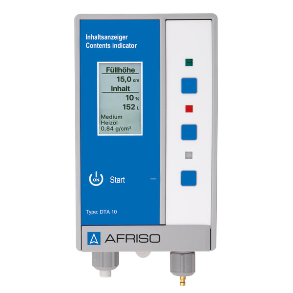 Products Our motto "Technology for Environmental Protection" has long been an inherent part of our product development philosophy and product range. We strive to improve the environment, to make processes which work with greater environmental compatibility and to avoid putting a strain on the environment. We offer you a multitude of innovative solutions, new products and smart concepts. More Informations Industries & Topics Industries & Topics Overview Fuel oil components Fuel oil components Overview Fast and clean oil filter change Avoiding fungal attacks in biofuel More performance with the sintered plastic sieve AFRISO Smart Home AFRISO Smart Home Overview Gateway HG 02 Products Products Overview AFRISOhome App Alexa Smart home applications Smart home applications Overview Leakage security Security Stand-alone applications Stand-alone applications Overview Getting started with AFRIShome Smart Home Craft 4.0 Craft 4.0 Overview OEM-Manifold systems Hydraulic Balancing Hydraulic Balancing Overview VarioQ Vario-DP Tank conversion Hygienic processes AFRISO Smart Home AFRISO Smart Home offers innovative solutions for intelligent home automation. With modern sensors and actuators, you can easily and conveniently control your home. More Informations Service-Center Service-Center Overview Service Contact persons Data exchange formats Catalogs Service-Center Flexible, cost-aware, on schedule, solution-oriented and fast – the AFRISO team always provides the decisive added value. More Informations Training & Events Training & Events Overview Exhibitions Exhibitions Overview SHK+E 2026, Essen IFH Intherm 2026, Nuremberg GET Nord 2026, Hamburg Search ... DTA 10 52155 Digitaler Tankinhaltsanzeiger DTA 10 Cylindrical, horizontal rainwater tank with digital tank contents indicator DTA 10 Images 4 Back DTA 10 | 52155 digital tank contents indicator in-stock items Documents Benefits For fuel oil EL, L, diesel fuel, biodiesel, HVO, GTL, water and other media with a density from 0.5 to 1.5 g/cm3universal application in tanks of a height of up to 4 mPush-to-Read function: Fast start with just a push of a buttonbacklit digital displayMeasured values are displayed in litres, % and liquid level (cm)user interface language selectable (English, German or French)location-independent battery operation - no external supply voltage requiredRemote measurements up to 15 mmaterials resistant to biofuel and biodiesel with max. 100 % FAMEgreen fuels ready: suitable for use at tank facilities filed with the new paraffinic fuels HVO or GTL Application Location-independent level measurement with digital display and minimum level signal (reserve level alarm) with a single measurement. For tanks with fuel oil EL, L (DIN 51603-1), diesel fuel (EN 590), water (no drinking water!), AdBlue®, liquid fuels as per DIN SPEC 51603-6 and DIN/TS 51603-8 as well as biofuel and biodiesel with up to 100 % FAME (EN 14214). This product is therefore ideal for all ecologically upgraded fuel oil consuming systems that use the new paraffinic fuels HVO or GTL as an admixture or 100 %. For maximum accuracy of the displayed measured value, determine the density of the medium and set it at the DTA when using these fuels. In addition, DTA 10 can be used for level measurement with all non-corrosive liquids with a density from 0.5 to 1.5 g/cm3. Suitable for tanks up to 400 cm liquid level. Remote measurements (measuring line) up to 15 m. Description The electro-pneumatic tank contents indicator DTA 10 consists of a battery-operated control unit with digital display and a measuring line. Measured values are displayed in litres, % and liquid level (cm). Simple operation and setup via three function keys. Measurements are requested by means of pressing the control key (Push-to-Read function). If the level falls below a minimum level that is freely adjustable as a percentage, the backlight of the display flashes red to indicate an alarm during the measurement. Standard tank shapes (linear and cylindrical, horizontal) are stored. Measuring line connection for hose with 4 mm inside diameter. Einsatzmedien Info Die chemische Beständigkeit sowie Einsatz- und Funktionsfähigkeit dieses Produktes ist auch bei Verwendung von Biodiesel / Bioheizöl mit bis zu 100 % FAME-Beimischung gegeben. Zulassungen Technical data Downloads Accessories Technical data functionsPush-to-Read level measurementMeasuring range (tank height)Fuel oil: 0/400 cmWater: 0/350 cmMeasuring accuracy± 3 cmOperating temperature rangeAmbient: 0/50 °CStorage: -20/+65 °CMedium: 0/50 °CDisplaymulti-coloured, backlit graphical display (30 x 50 mm),weiß = Betrieb,red = Alarm,grün = Parametrierebene,indication of litres (5 digits), % or liquid level in cmSupply voltage9 V monobloc batteryMinimum alarmbacklight flashes red during measurement processHousingWall mounting housing made of impact-resistant plastic (PC/ABS)W x H x D: 100 x 188 x 65 mmDegree of protection: IP 20 (EN 60529)Scope of deliverycontrol unit with battery Downloads Tankinhaltsanzeiger DTA 10 Manuals PDF Download Accessories Accessories and spare parts for level indicators and level controllers Abb. Bezeichnung Montageset Pneumatische Füllstandmessgeräte | 20142 Flansch-Adapter | 20900 Condensate trap KG 2 | 20320 Montageset Pneumatische Füllstandmessgeräte | 52154 Mounting accessories for inner linings Abb. Bezeichnung Schlauchverbinder GS | 43945 Accessories and spare parts for level sensors, overfill prevention systems and level controllers Abb. Bezeichnung Reduzierstück, Kunststoff | 20905 Reduzierstück, Kunststoff | 20903 Mounting accessories Abb. Bezeichnung Dichtungsrahmen IP 54 | 43416 mounting frame | 43521 Montageset WATCHDOG Warngeräte | 43100 Related products