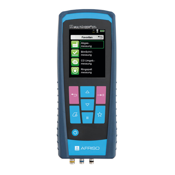 Products Our motto "Technology for Environmental Protection" has long been an inherent part of our product development philosophy and product range. We strive to improve the environment, to make processes which work with greater environmental compatibility and to avoid putting a strain on the environment. We offer you a multitude of innovative solutions, new products and smart concepts. More Informations Industries & Topics Industries & Topics Overview Fuel oil components Fuel oil components Overview Fast and clean oil filter change Avoiding fungal attacks in biofuel More performance with the sintered plastic sieve AFRISO Smart Home AFRISO Smart Home Overview Gateway HG 02 Products Products Overview AFRISOhome App Alexa Smart home applications Smart home applications Overview Leakage security Security Stand-alone applications Stand-alone applications Overview Getting started with AFRIShome Smart Home Craft 4.0 Craft 4.0 Overview OEM-Manifold systems Hydraulic Balancing Hydraulic Balancing Overview VarioQ Vario-DP Tank conversion Hygienic processes AFRISO Smart Home AFRISO Smart Home offers innovative solutions for intelligent home automation. With modern sensors and actuators, you can easily and conveniently control your home. More Informations Service-Center Service-Center Overview Service Contact persons Data exchange formats Catalogs Service-Center Flexible, cost-aware, on schedule, solution-oriented and fast – the AFRISO team always provides the decisive added value. More Informations Training & Events Training & Events Overview Exhibitions Exhibitions Overview SHK+E 2026, Essen IFH Intherm 2026, Nuremberg GET Nord 2026, Hamburg Search Domestic technology Portable measuring instruments for service and maintenance MULTILYZER STx - Set Images 4 MULTILYZER STx - Set Flue gas analyser Variants Documents Benefits All-in-one: Flue gas analysis, (differential) pressure measurement, (differential) temperature measurement, dust measurement, Pitot measurement (in conjunction with STM 225)ECO sensor: Lead-free O2 sensor with long service life and optimised calibration phase, short response time, resistant to biogenous fuelsCan be equipped with a combination of up to six sensors: O2, CO/H2, NO, SO2, NO2 und COhighCO room air monitoringqA mean value measurement as per 1st German Federal Immission Act BlmSchVQuick-access function keys for direct data accessMeasurement logs as QR code, database memory, customer data management5 years warranty on O2, CO/H2 sensors7 years full warranty in connection with a service contractCAPBs®-enabled Application Flue gas analyser for measuring small and medium-sized oil, gas and pellets fired heating systems according to the German Federal Immission Act and for CO concentration safety checks at gas fired systems. Ideal for servicing solid fuel systems (for example, coal or wood fired systems with temporary CO peaks) or bivalent, modulating combined heating and power plants. If used within the framework of dust measurements, MULTILYZER STx determines the flue gas value and serves as the central controller for the dust measuring instrument STM 225. Einsatzmedien Schnittstellen Zulassungen Variants Technical data Downloads Accessories Variants sensors / functionsPart no.MULTILYZER STx Set 1O2, COH2, (differential) temperature, draft, differential pressureP04729210MULTILYZER STx Set 2O2, COH2, NO, (differential) temperature, draft, differential pressureP04730210MULTILYZER STx Set 3O2, COH2, CO40,000, (differential) temperature, draft, differential pressureP04741210MULTILYZER STx Set 4O2, COH2, NO, CO40,000, (differential)temperature, draft, differential pressureP04748210MULTILYZER STx Set 5O2, COH2, CO40,000, (differential) temperature, draft, differential pressure, module particulate matter measurementP04741217 in-stock items manufactured goods Technical data measuring ranges (measured values)Flue gas temperature/differential temperature0/1 150 °CAir temperature/combustion air temperature-20/+200 °CDraft-70/+70 hPaDifferential pressure-150/+150 hPabarometric pressure500/1 150 hPaPitot0.5/70 m/sO2 measurement0/21 Vol.-%COH2 measurementmaximum: 0/10 000 ppmadditional technical specificationsIndication (calculated values)CO2, COunverdünnt, Lambda, Eta-Wirkungsgrad, Flue gas losses qA, Taupunkt, temperature difference, CO mg/m3 (Erdgas), CO mg/kWh (fuel oil)Operating temperature rangeAmbient: 5/40 °CStorage: -20/+50 °Cweight (measuring instrument) 631 g (depends on equipment with sensors)DimensionsW x H x D: 90 x 220 x 53 mmDegree of protectionIP 42 (EN 60529)DisplayTFT colour display 3.5 "W x H: 53 x 71 mm240 x 320 pixelsConnectionsDraft/pressure: ∅ 7 mmGas: ∅ 8 mmtemperature: socket type KSupply voltagelithium-ion battery (3.6 V/2900 mAh)power supply unit (mini USB)Battery or mainsHours of operationmax. 12 StundenData memorymicroSD card, max. 32 GBData logger1-999 seconds, interval freely selectableInterfacesInfrared,Bluetooth®,QR code generator,MicroSD-KartenslotApprovals1. BImSchV,KÜO (TÜV ByRgG 301),EN 50379-2Scope of deliveryMeasuring instrumentKalibrierprotokollprotective sleeve for device with magnetsNetzteil NTE 5 USB-ACharging cable USB-A - mini USBMicroSD-Karte inkl. USB 2.0 SD-Card-ReaderBase handle AWS-B for interchangeable probes 2.4 m condensate filter cartridge/draftWechselsonde AWS-S 300 mmCondensate filter cartridge KFPInfiltec-Feinfilter (5 Stück)Teflon membrane (5 pieces)Umgebungsluftfühler TFB-UL 50-1connection kit ASS-DPGerätekoffer Downloads UN38-3_CR2032_-P_-N.PDF Domestic Technology PDF Download UN38-3_PA-LN19_R001.PDF Domestic Technology PDF Download Abgasmessgerät MULTILYZER STx Manuals PDF Download Accessories Transport systems / cases / protective sleeve Abb. Bezeichnung Kunststoff-Systemkoffer | 500900 Related products