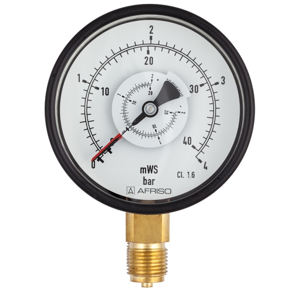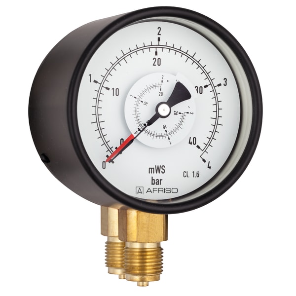 Products Our motto "Technology for Environmental Protection" has long been an inherent part of our product development philosophy and product range. We strive to improve the environment, to make processes which work with greater environmental compatibility and to avoid putting a strain on the environment. We offer you a multitude of innovative solutions, new products and smart concepts. More Informations Industries & Topics Industries & Topics Overview Fuel oil components Fuel oil components Overview Fast and clean oil filter change Avoiding fungal attacks in biofuel More performance with the sintered plastic sieve AFRISO Smart Home AFRISO Smart Home Overview Gateway HG 02 Products Products Overview AFRISOhome App Alexa Smart home applications Smart home applications Overview Leakage security Security Stand-alone applications Stand-alone applications Overview Getting started with AFRIShome Smart Home Craft 4.0 Craft 4.0 Overview OEM-Manifold systems Hydraulic Balancing Hydraulic Balancing Overview VarioQ Vario-DP Tank conversion Hygienic processes AFRISO Smart Home AFRISO Smart Home offers innovative solutions for intelligent home automation. With modern sensors and actuators, you can easily and conveniently control your home. More Informations Service-Center Service-Center Overview Service Contact persons Data exchange formats Catalogs Service-Center Flexible, cost-aware, on schedule, solution-oriented and fast – the AFRISO team always provides the decisive added value. More Informations Training & Events Training & Events Overview Exhibitions Exhibitions Overview SHK+E 2026, Essen IFH Intherm 2026, Nuremberg GET Nord 2026, Hamburg Search Domestic technology Pressure measuring instruments for domestic technology RF100Dif D201 Images 4 RF100Dif D201 Rohrfeder-Standardmanometer für Differenzdruck Typ D2 Variants Documents Benefits Indication of plus pressure, minus pressure and differential pressureexcellent price/performance ratiotwo independent Bourdon tube systemsHousing and wetted parts also available in stainless steel (option) Application For differential pressure measurement of gaseous and liquid media which are not highly viscous, do not crystallize and do not attack copper alloys. Specially suitable for heating systems (supply and return pipes).! For measuring gas or vapour, observe the table "Selection Criteria as per EN 837-2" (see appendix)! Variants Technical data Technical drawings Downloads Variants Typehousing ⌀Housingaccuracy classConnectionAusrichtungRangeTypeTypePart no.RF100Dif D201100 mmSheet steel1,62 x G½B0/0.6 barRF100DifD20185609201RF100Dif D201100 mmSheet steel1,62 x G½B0/1 barRF100DifD20185610201RF100Dif D201100 mmSheet steel1,62 x G½B0/1.6 barRF100DifD20185611201RF100Dif D201100 mmSheet steel1,62 x G½B0/2.5 barRF100DifD20185612201RF100Dif D201100 mmSheet steel1,62 x G½B0/4 barRF100DifD20185613201RF100Dif D201100 mmSheet steel1,62 x G½B0/6 barRF100DifD20185614201RF100Dif D201100 mmSheet steel1,62 x G½B0/10 barRF100DifD20185615201RF100Dif D201100 mmSheet steel1,62 x G½B0/16 barRF100DifD20185616201RF100Dif D201100 mmSheet steel1,62 x G½B0/25 barRF100DifD20185617201RF100Dif D201100 mmSheet steel1,62 x G½B0/40 barRF100DifD20185618201RF100Dif D201100 mmSheet steel1,62 x G½B0/60 barRF100DifD20185619201 in-stock items manufactured goods Technical data TypeD2Nominal size100 - 100FunctionThe pressures are measured in two independent Bourdon tube systems ("plus" pressure = high pressure, "minus" pressure = low pressure). The pressure is indicated by means of a dial and a pointer. The differential pressure scale covers 50 % of the range of the "plus" pressure and 50 % of the range of the "minus" pressure. The black pointer ("plus" connection) and the red pointer ("minus" connection) at the differential pressure gauge scale allow you to read the pressures in both systems on the fixed scale.accuracy class (EN 837-1/6)1,6ranges (EN 837-1/5)see ordering tableapplication areaThe maximum pressure in the system must not exceed the full scale value. For good readability, the differential pressure to be measured should not be less than approx. 20 % of the full scale value.Operating temperature rangeMedium: max. 60 °CAmbient: -20/+60 °CTemperature performanceIndication error when the temperature of the measuring system deviates from the normal temperature of 20 °C:bei Temperaturzunahme ca. ± 0,4 %/10 K,falling temperature approx. ± 0.4 %/10 Kvom jeweiligen SkalenendwertDegree of protectionIP 32 (EN 60529) Standard design ConnectionBrass, bottom, parallel, one behind the other2 x G½B, SW22 (EN 837-1/7.3)Measuring elementBourdon tube, "C" type tube, Copper alloymovementBrassDialAluminium, weißdual scale bar outer - mWC innerScaling blackPointerAluminium, schwarzdialAluminiumHousingStahlblech, schwarzpush on bezelStahlblech, schwarzwindowInstrumentenglas Technical drawings Click the corresponding image for detail views, additional information and dimension tables. Bottom connection Dimensions (mm) NG a b G hk SW 100 15,6 84 G½B 8632 22 Downloads Messtechnik für Wasserstoff-Applikationen PDF English German AFRISO_EU-KONFORMITAETSERKLAERUNG_DRUCKGERAETE_DE.PDF Industrial technology PDF Download Montage Manometer Manuals Industrial technology PDF Download Rohrfeder-, Kapselfeder-, Plattenfeder-, Membranfedermanometer für Differenzdruck Manuals Industrial technology PDF Ukrainian German German Related products