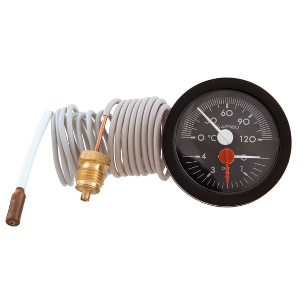 Products Our motto "Technology for Environmental Protection" has long been an inherent part of our product development philosophy and product range. We strive to improve the environment, to make processes which work with greater environmental compatibility and to avoid putting a strain on the environment. We offer you a multitude of innovative solutions, new products and smart concepts. More Informations Industries & Topics Industries & Topics Overview Fuel oil components Fuel oil components Overview Fast and clean oil filter change Avoiding fungal attacks in biofuel More performance with the sintered plastic sieve AFRISO Smart Home AFRISO Smart Home Overview Gateway HG 02 Products Products Overview AFRISOhome App Alexa Smart home applications Smart home applications Overview Leakage security Security Stand-alone applications Stand-alone applications Overview Getting started with AFRIShome Smart Home Craft 4.0 Craft 4.0 Overview OEM-Manifold systems Hydraulic Balancing Hydraulic Balancing Overview VarioQ Vario-DP Tank conversion Hygienic processes AFRISO Smart Home AFRISO Smart Home offers innovative solutions for intelligent home automation. With modern sensors and actuators, you can easily and conveniently control your home. More Informations Service-Center Service-Center Overview Service Contact persons Data exchange formats Catalogs Service-Center Flexible, cost-aware, on schedule, solution-oriented and fast – the AFRISO team always provides the decisive added value. More Informations Training & Events Training & Events Overview Exhibitions Exhibitions Overview SHK+E 2026, Essen IFH Intherm 2026, Nuremberg GET Nord 2026, Hamburg Search Domestic technology Pressure measuring instruments for domestic technology THMK 52 Images 2 THMK 52 Thermo-Manometer mit Kapillarleitung Variants Documents Benefits ideal for boilers and hot water storage tankscorrosion-resistant, highly impact-resistant plastic housingmany customised versions available Application Heating, cooling and plumbing, e.g. boilers, buffer tanks. Variants Technical data Downloads Variants Typehousing ⌀Housingpush on bezelPointerDialScaleRangecapillary lengthTypePart no.temperaturepressureTHMK 5252 mmwhiteblackwhite0/120 °C0/4 bar500 mmTHMK 5267635105THMK 5252 mmwhiteblackwhite0/120 °C0/4 bar1000 mmTHMK 5267635115THMK 5252 mmwhiteblackwhite0/120 °C0/4 bar1500 mmTHMK 5267635125THMK 5252 mmwhiteblackwhite0/120 °C0/4 bar2000 mmTHMK 5267635135 in-stock items manufactured goods Technical data Nominal size52 - 52Rangepressure: 0/4 bartemperature: 0/120 °CAccuracy/test pointpressure: 4,0temperature: 50 °C = 3 °CMeasuring principlepressure: Bourdon tube, Copper alloytemperature: Liquid fillingapplication areapressurestatic load: ¾ x full scale valuedynamic load: ⅔ x full scale valueshort-term: Full scale valuetemperature: Full scale valueOperating temperature rangeMedium: Full scale valueAmbient: max. 70 °COperating pressurewithout pressureDegree of protectionIP 32 (EN 60529) Standard design Connectionpressure: G¼B, Brasstemperature: ∅ 6 x 30 mm, CopperCapillary tube: Copper with PVC coating (R3, grey)DialPlastic, blackScaling whitePointerPlastic, whiteHousingPlastic (ABS), greywindowKunststoff with reference pointerBezelpush on bezelKunststoff (ABS), schwarzcapillary length500 mm Downloads AFRISO_EU-KONFORMITAETSERKLAERUNG_DRUCKGERAETE_DE.PDF Industrial technology PDF Download Rohrfeder-, Kapselfeder-, Plattenfeder-, Membranfedermanometer für Differenzdruck Manuals Industrial technology PDF Ukrainian German German Related products