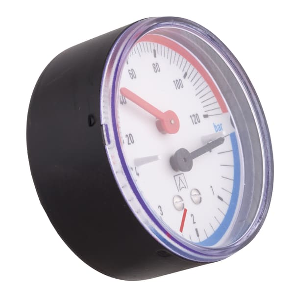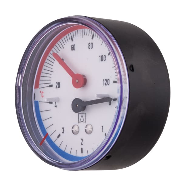 Images 4 Back TM63 D211 | 63318 combined thermometer/pressure gauge manufactured goods Documents Benefits pressure and temperature measurement with at a single measuring pointwith self-sealing connection thread for fast installationBottom connection or back connectionwith mounting valve for easy replacement without downtime Application For liquid media which are not highly viscous, do not crystallise and do not attack copper alloys. For combined measurement of pressure and temperature, especially in heating systems and heating boilers. Description The combined thermometer/pressure gauge / thermo-hydrometer consists of a Bourdon tube measuring system for pressure measurement and a bimetal measuring system for simultaneous temperature measurement. Both values are measured and displayed by a single gauge. A self-closing mounting valve enable easy replacement of the measuring instrument without requiring the system to be drained. An optional M18 x 1 to G¼ adapter is available if the combined thermometer/pressure gauge has to be mounted into an existing thermowell with M18 x 1 female thread. Technical data Downloads Technical data TypeD2Nominal size63 - 63accuracy classPressure gauges: 2,5 (EN 837-1/6)Rangepressure: 0/4 bartemperature: 20/120 °Capplication areapressurestatic load: ¾ x full scale valuedynamic load: ⅔ x full scale valueshort-term: Full scale valuetemperature: Full scale valueOperating temperature rangeMedium: max. 120 °CAmbient: -20/+60 °CTemperature performancepressure: Indication error when the temperature of the measuring system deviates from the normal temperature of 20 °C:bei Temperaturzunahme ca. ± 0,4 %/10 K,falling temperature approx. ± 0.4 %/10 Kvom jeweiligen SkalenendwertDegree of protectionIP 32 (EN 60529) Standard design ConnectionBrass, centre backG¼B with mounting valve G¼ to R½Measuring elementpressure: Bourdon tube, Copper alloytemperature: Bimetal spiralDialKunststoff, weißScalingblack with red/blue circular arcsPointerpressure: Kunststoff, schwarztemperature: Kunststoff, rotHousingD2: Stahlblech, schwarzwindowKunststoff, eingeclipst with adjustable red mark Downloads Montage Manometer Manuals Industrial technology PDF Download Rohrfeder-, Kapselfeder-, Plattenfeder-, Membranfedermanometer für Differenzdruck Manuals Industrial technology PDF Ukrainian German German AFRISO_EU-KONFORMITAETSERKLAERUNG_DRUCKGERAETE_DE.PDF Industrial technology PDF Download