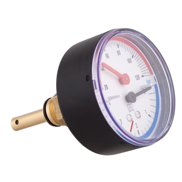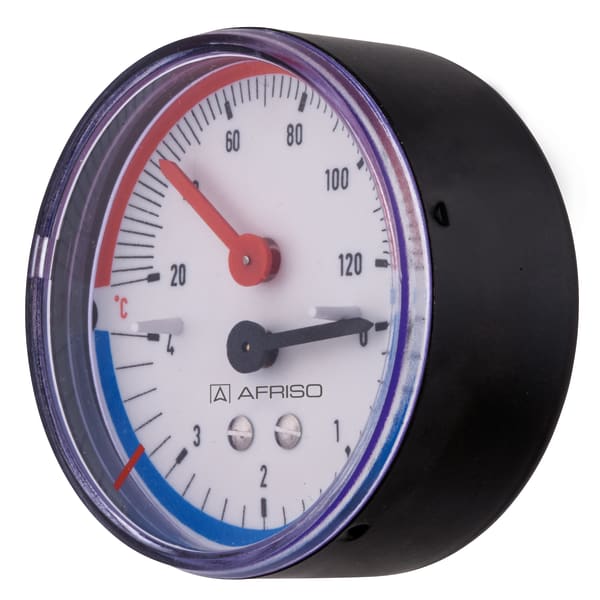 Products Our motto "Technology for Environmental Protection" has long been an inherent part of our product development philosophy and product range. We strive to improve the environment, to make processes which work with greater environmental compatibility and to avoid putting a strain on the environment. We offer you a multitude of innovative solutions, new products and smart concepts. More Informations Industries & Topics Industries & Topics Overview Fuel oil components Fuel oil components Overview Fast and clean oil filter change Avoiding fungal attacks in biofuel More performance with the sintered plastic sieve AFRISO Smart Home AFRISO Smart Home Overview Gateway HG 02 Products Products Overview AFRISOhome App Alexa Smart home applications Smart home applications Overview Leakage security Security Stand-alone applications Stand-alone applications Overview Getting started with AFRIShome Smart Home Craft 4.0 Craft 4.0 Overview OEM-Manifold systems Hydraulic Balancing Hydraulic Balancing Overview VarioQ Vario-DP Tank conversion Hygienic processes AFRISO Smart Home AFRISO Smart Home offers innovative solutions for intelligent home automation. With modern sensors and actuators, you can easily and conveniently control your home. More Informations Service-Center Service-Center Overview Service Contact persons Data exchange formats Catalogs Service-Center Flexible, cost-aware, on schedule, solution-oriented and fast – the AFRISO team always provides the decisive added value. More Informations Training & Events Training & Events Overview Exhibitions Exhibitions Overview SHK+E 2026, Essen IFH Intherm 2026, Nuremberg GET Nord 2026, Hamburg Search Domestic technology Pressure measuring instruments for domestic technology 63348 TM 80 20/120C 0/4bar 1/2 ax mit Ventil/Adapter D211 Images 4 Back TM80 D211 | 63348 combined thermometer/pressure gauge manufactured goods Documents Benefits pressure and temperature measurement with at a single measuring pointwith self-sealing connection thread for fast installationBottom connection or back connectionwith mounting valve for easy replacement without downtime Application For liquid media which are not highly viscous, do not crystallise and do not attack copper alloys. For combined measurement of pressure and temperature, especially in heating systems and heating boilers. Description The combined thermometer/pressure gauge / thermo-hydrometer consists of a Bourdon tube measuring system for pressure measurement and a bimetal measuring system for simultaneous temperature measurement. Both values are measured and displayed by a single gauge. A self-closing mounting valve enable easy replacement of the measuring instrument without requiring the system to be drained. An optional M18 x 1 to G¼ adapter is available if the combined thermometer/pressure gauge has to be mounted into an existing thermowell with M18 x 1 female thread. Technical data Downloads Technical data TypeD2Nominal size80 - 80accuracy classPressure gauges: 2,5 (EN 837-1/6)Rangepressure: 0/4 bartemperature: 20/120 °Capplication areapressurestatic load: ¾ x full scale valuedynamic load: ⅔ x full scale valueshort-term: Full scale valuetemperature: Full scale valueOperating temperature rangeMedium: max. 120 °CAmbient: -20/+60 °CTemperature performancepressure: Indication error when the temperature of the measuring system deviates from the normal temperature of 20 °C:bei Temperaturzunahme ca. ± 0,4 %/10 K,falling temperature approx. ± 0.4 %/10 Kvom jeweiligen SkalenendwertDegree of protectionIP 32 (EN 60529) Standard design ConnectionBrass, centre backG¼B with mounting valve G¼ to R½ Adapter G¼ auf M 18 x 1Measuring elementpressure: Bourdon tube, Copper alloytemperature: Bimetal spiralDialKunststoff, weißScalingblack with red/blue circular arcsPointerpressure: Kunststoff, schwarztemperature: Kunststoff, rotHousingD2: Stahlblech, schwarzwindowKunststoff, eingeclipst with adjustable red mark Downloads Montage Manometer Manuals Industrial technology PDF Download Rohrfeder-, Kapselfeder-, Plattenfeder-, Membranfedermanometer für Differenzdruck Manuals Industrial technology PDF Ukrainian German German AFRISO_EU-KONFORMITAETSERKLAERUNG_DRUCKGERAETE_DE.PDF Industrial technology PDF Download Related products