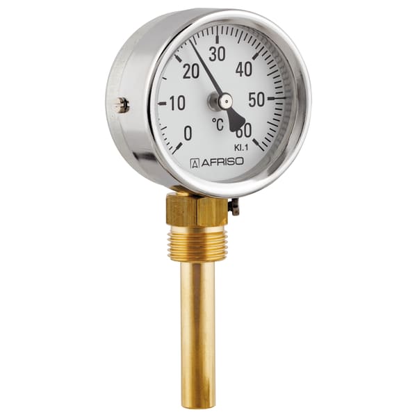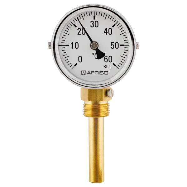 Products Our motto "Technology for Environmental Protection" has long been an inherent part of our product development philosophy and product range. We strive to improve the environment, to make processes which work with greater environmental compatibility and to avoid putting a strain on the environment. We offer you a multitude of innovative solutions, new products and smart concepts. More Informations Industries & Topics Industries & Topics Overview Fuel oil components Fuel oil components Overview Fast and clean oil filter change Avoiding fungal attacks in biofuel More performance with the sintered plastic sieve AFRISO Smart Home AFRISO Smart Home Overview Gateway HG 02 Products Products Overview AFRISOhome App Alexa Smart home applications Smart home applications Overview Leakage security Security Stand-alone applications Stand-alone applications Overview Getting started with AFRIShome Smart Home Craft 4.0 Craft 4.0 Overview OEM-Manifold systems Hydraulic Balancing Hydraulic Balancing Overview VarioQ Vario-DP Tank conversion Hygienic processes AFRISO Smart Home AFRISO Smart Home offers innovative solutions for intelligent home automation. With modern sensors and actuators, you can easily and conveniently control your home. More Informations Service-Center Service-Center Overview Service Contact persons Data exchange formats Catalogs Service-Center Flexible, cost-aware, on schedule, solution-oriented and fast – the AFRISO team always provides the decisive added value. More Informations Training & Events Training & Events Overview Exhibitions Exhibitions Overview SHK+E 2026, Essen IFH Intherm 2026, Nuremberg GET Nord 2026, Hamburg Schulungen & Trainings Schulungen & Trainings Overview Heizen mit flüssigen Brennstoffen Inhouse-Schulung - Heizen mit flüssigen Brennstoffen Inhouse-Schulung Heizölverbraucheranlagen Smart Home Experte Search Domestic technology Temperature measuring instruments for domestic technology BiTh 63 I D201 Images 5 BiTh 63 I D201 Bimetall-Industriethermometer Variants Benefits ranges: -20/+60, 0/60, 0/120, 0/160 °Cbrass thermowellbrass stem Application Mechanical engineering, plant engineering, pipelines, boilers, heating technology Variants Technical data Technical drawings Variants Typehousing ⌀mounting positionRangeStem lengthTypeTypePart no.BiTh 63 I63 mmbottom0/60 °C45 mmBiTh 63 ID20165131201BiTh 63 I63 mmbottom0/60 °C63 mmBiTh 63 ID20165132201BiTh 63 I63 mmbottom0/60 °C100 mmBiTh 63 ID20165133201BiTh 63 I63 mmbottom0/60 °C150 mmBiTh 63 ID20165134201 in-stock items manufactured goods Technical data TypeD2Nominal size63 - 63measuring elementBimetal helixaccuracy class1 (EN 13190)ranges °C0/60 °CApplication area (EN 13190)continuous load: Measuring rangeshort-term: RangeOperating pressure at thermowellmax. 10 bar (max. static)Degree of protectionIP 41 (EN 60529) Standard design ConnectionStem: Brass, ∅ 9 mmThermowell: G½B, Brass, ∅ 12 mm, removablemounting positionbottomDialAluminium, weißScaling blackPointerAluminium, schwarzHousingStahlblech, verzinktpush on bezelStahlblech, vernickeltwindowInstrumentenglas Technical drawings Click the corresponding image for detail views, additional information and dimension tables. Bottom connection Dimensions (mm)NGab1Dd2FGlSW631034631243,5G½B40221034631243,5G½B63221034631243,5G½B100221034631243,5G½B15022801036801252G½B40221036801252G½B63221036801252G½B100221036801252G½B1502210010361001262G½B402210361001262G½B632210361001262G½B1002210361001262G½B15022160371601292G½B4022371601292G½B6322371601292G½B10022371601292G½B15022 Related products