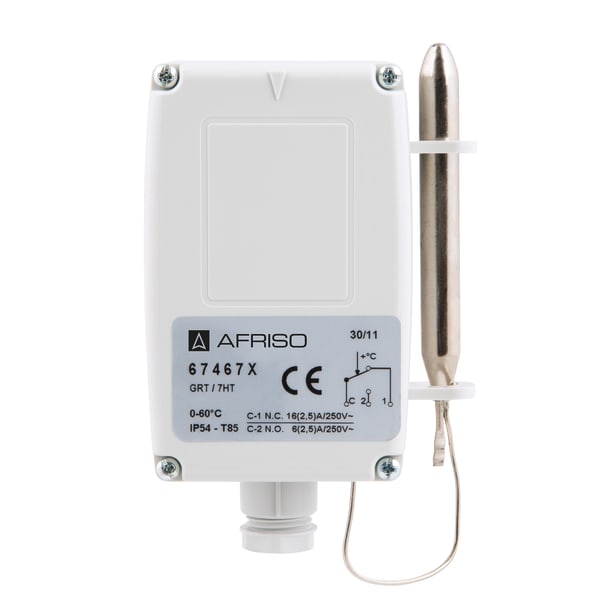 Products Our motto "Technology for Environmental Protection" has long been an inherent part of our product development philosophy and product range. We strive to improve the environment, to make processes which work with greater environmental compatibility and to avoid putting a strain on the environment. We offer you a multitude of innovative solutions, new products and smart concepts. More Informations Industries & Topics Industries & Topics Overview Fuel oil components Fuel oil components Overview Fast and clean oil filter change Avoiding fungal attacks in biofuel More performance with the sintered plastic sieve AFRISO Smart Home AFRISO Smart Home Overview Gateway HG 02 Products Products Overview AFRISOhome App Alexa Smart home applications Smart home applications Overview Leakage security Security Stand-alone applications Stand-alone applications Overview Getting started with AFRIShome Smart Home Craft 4.0 Craft 4.0 Overview OEM-Manifold systems Hydraulic Balancing Hydraulic Balancing Overview VarioQ Vario-DP Tank conversion Hygienic processes AFRISO Smart Home AFRISO Smart Home offers innovative solutions for intelligent home automation. With modern sensors and actuators, you can easily and conveniently control your home. More Informations Service-Center Service-Center Overview Service Contact persons Data exchange formats Catalogs Service-Center Flexible, cost-aware, on schedule, solution-oriented and fast – the AFRISO team always provides the decisive added value. More Informations Training & Events Training & Events Overview Exhibitions Exhibitions Overview SHK+E 2026, Essen IFH Intherm 2026, Nuremberg GET Nord 2026, Hamburg Schulungen & Trainings Schulungen & Trainings Overview Heizen mit flüssigen Brennstoffen Inhouse-Schulung - Heizen mit flüssigen Brennstoffen Inhouse-Schulung Heizölverbraucheranlagen Smart Home Experte Search ... GRT/ETR 67467X GRT/7HT 0/60°C Images 2 Back GRT/ETR | 67467X room thermostat with housing in-stock items Benefits mechanical temperature controllerfor monitoring of greenhousesfor use in animal breeding applicationseasy wall mounting Application Mechanical room thermostat for industrial use. Due to the high degree of protection, the device can be used in humid rooms and in animal breeding applications. The room thermostats are also suitable for temperature monitoring in greenhouses. Description The temperature measured at the probe causes a change in the volume of the measuring liquid. Electrical switching is triggered by the force acting. Technical data Technical data TypeGRTOperating rangesee ordering tableTolerance±0.4 %/10 KSwitching differential0/55 °C: ∆T 3 ± 1 KSettingGRT/ERT/ETR: InternalProbeCopper, nickel-platedProbe elementliquid-filledOperating temperature rangeHousing: max. 65 °CHousingplastic (PVC), grey (RAL 7035)Cable entryplastic (PVC), blackM16 x 1.5Degree of protectionIP 54 (EN 60529)electrical switching contactChangeover contactContact ratingNC: AC 250 V, 16 (2.5) ANO: AC 250 V, 6 (2.5) A Related products