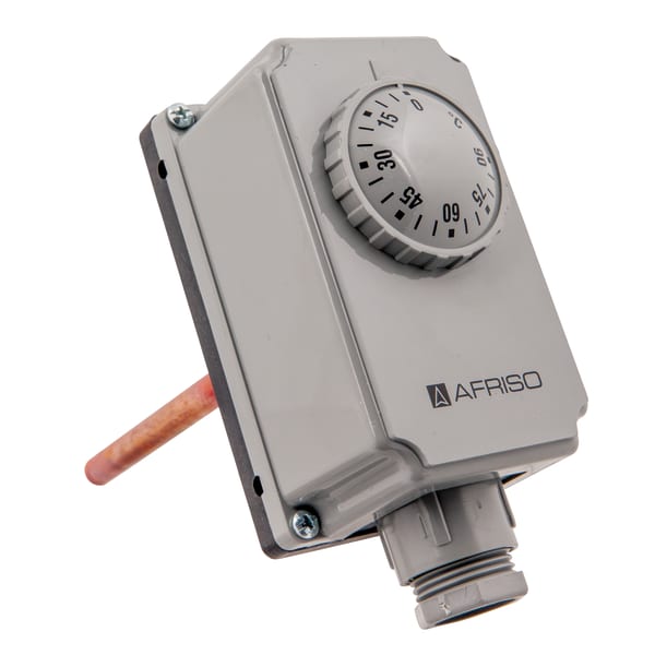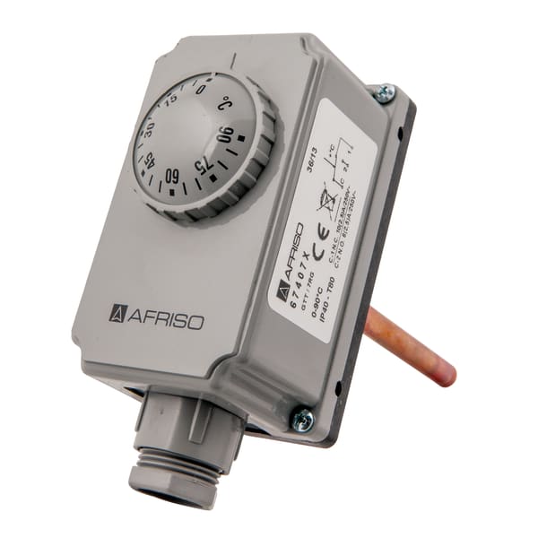 Products Our motto "Technology for Environmental Protection" has long been an inherent part of our product development philosophy and product range. We strive to improve the environment, to make processes which work with greater environmental compatibility and to avoid putting a strain on the environment. We offer you a multitude of innovative solutions, new products and smart concepts. More Informations Industries & Topics Industries & Topics Overview Fuel oil components Fuel oil components Overview Fast and clean oil filter change Avoiding fungal attacks in biofuel More performance with the sintered plastic sieve AFRISO Smart Home AFRISO Smart Home Overview Gateway HG 02 Products Products Overview AFRISOhome App Alexa Smart home applications Smart home applications Overview Leakage security Security Stand-alone applications Stand-alone applications Overview Getting started with AFRIShome Smart Home Craft 4.0 Craft 4.0 Overview OEM-Manifold systems Hydraulic Balancing Hydraulic Balancing Overview VarioQ Vario-DP Tank conversion Hygienic processes AFRISO Smart Home AFRISO Smart Home offers innovative solutions for intelligent home automation. With modern sensors and actuators, you can easily and conveniently control your home. More Informations Service-Center Service-Center Overview Service Contact persons Data exchange formats Catalogs Service-Center Flexible, cost-aware, on schedule, solution-oriented and fast – the AFRISO team always provides the decisive added value. More Informations Training & Events Training & Events Overview Exhibitions Exhibitions Overview SHK+E 2026, Essen IFH Intherm 2026, Nuremberg GET Nord 2026, Hamburg Schulungen & Trainings Schulungen & Trainings Overview Heizen mit flüssigen Brennstoffen Inhouse-Schulung - Heizen mit flüssigen Brennstoffen Inhouse-Schulung Heizölverbraucheranlagen Smart Home Experte Search Domestic technology Temperature measuring instruments for domestic technology GTT/7RG Images 5 GTT/7RG immersion thermostat with housing Variants Documents Benefits mechanical temperature controllerfor controlling heating and cooling processesideal for heat and process engineeringControl directly at the process Application Mechanical temperature controller and limiter. The device is suitable for application areas in the field of heat and process engineering. Heating and cooling processes in industrial or domestic applications can be controlled directly at the process. Description The temperature measured at the probe causes a change in the volume of the measuring liquid. Electrical switching is triggered by the force acting. The pocket allows for direct installation in pressure-tight tanks. Variants Technical data Downloads Variants adjustmentOperating rangeSwitching pointSwitching pointcapillary lengthStem lengthPart no.immersion thermostat with housing GTT/7RGExternal0/90 °C100 mm67407Ximmersion thermostat with housing GTT/7RGExternal70/210 °C100 mm67708immersion thermostat with housing GTT/7RGExternal0/90 °C150 mm67408AXimmersion thermostat with housing GTT/7RGExternal0/90 °C200 mm67408BX in-stock items manufactured goods Technical data TypeGTT/TC2Operating rangesee ordering tableTolerance± 1 K at ambient temperature 20 °CSwitching differential∆T 4 ± 1 KSettingGTT/7RG: ExternalProbe elementliquid-filledPocketCu alloyConnection: ½-14 NPTDiameter: ∅ 8 mmLength: 100 mmOperating temperature rangeProbe: max. 130 °CHousing: max. 85 °CProcess pressuremax. 4 barProbeCopperHousingplastic (PVC), grey (RAL 7035)Cable entryplastic (PVC), blackM20 x 1.5Degree of protectionIP 40 (EN 60529)Time constantDIN-testedDIN EN 14597:2012-09registration number TR/STB 1211electrical switching contactChangeover contactContact ratingNC AC 250 V, 10 (2.5) ANO AC 250 V, 6 (2.5) A Downloads Gehäusethermostate GTT, GTK, GDT PDF Download Related products